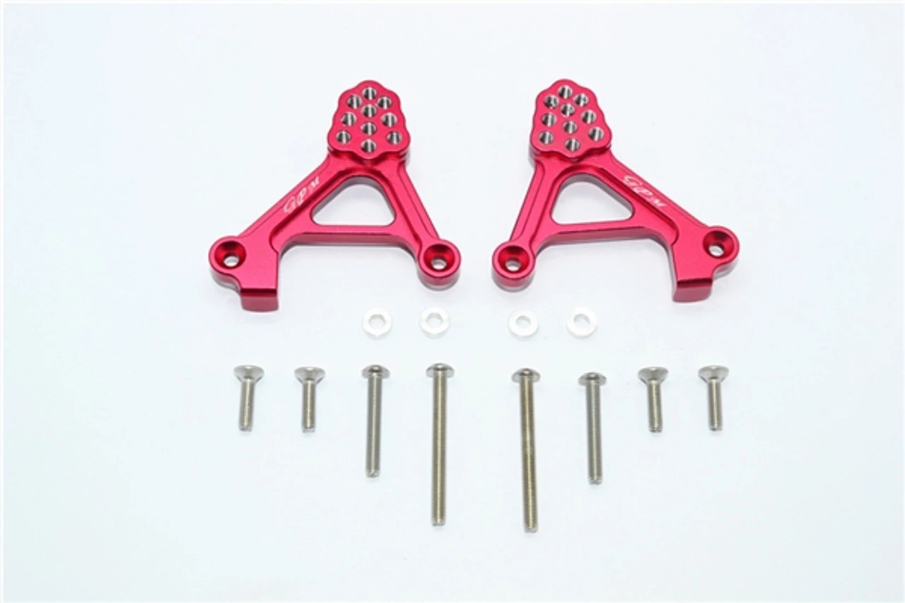 These are the GPM Racing Red Aluminum Adjustable Rear Shock Tower Mounts for Traxxas TRX-4 scale trail trucks and rock crawlers. These work with trucks such as the TRX-4 Land Rover Defender, Sport, and Tactical versions. Made of 6061-T6 aluminum, these are durable, offer additional suspension setup options, and look great! Stainless steel mounting hardware is included.
