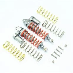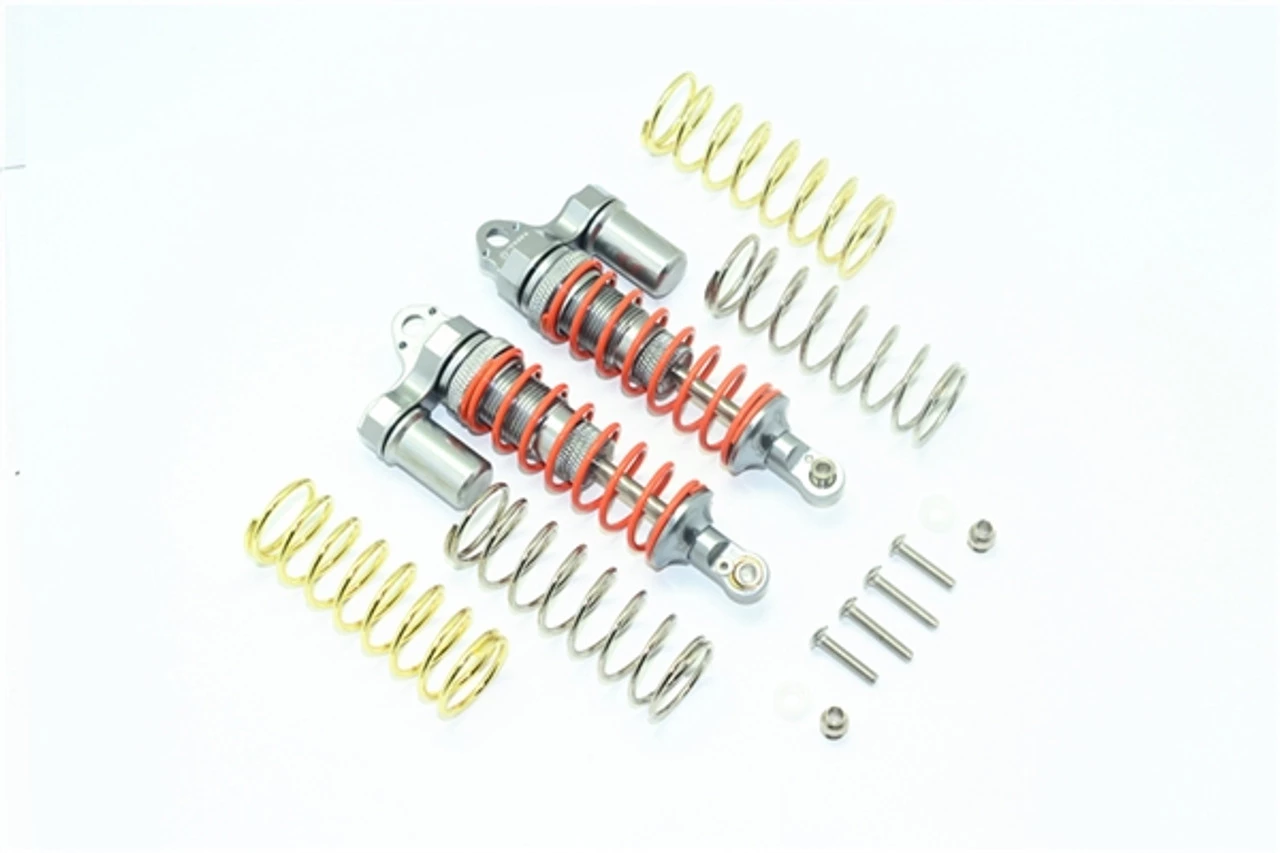 These are the GPM Racing Gunmetal Aluminum Adjustable 87mm Front Piggyback Shocks for Traxxas Slash 4×4, Rustler 4×4, and Stampede 4×4 trucks. Made of 6061-T6 aluminum, with a beefy 4mm steel shock shaft, these are a great upgrade for bashers and show trucks alike. The added oil volume helps keep the oil temp more consistent for less variation in shock performance throughout a run. These feature a threaded shock body with adjuster nut, and include with three sets of springs to adjust the stiffness to suit your driving surface. They are pre-filled with oil, making installation fast and easy!