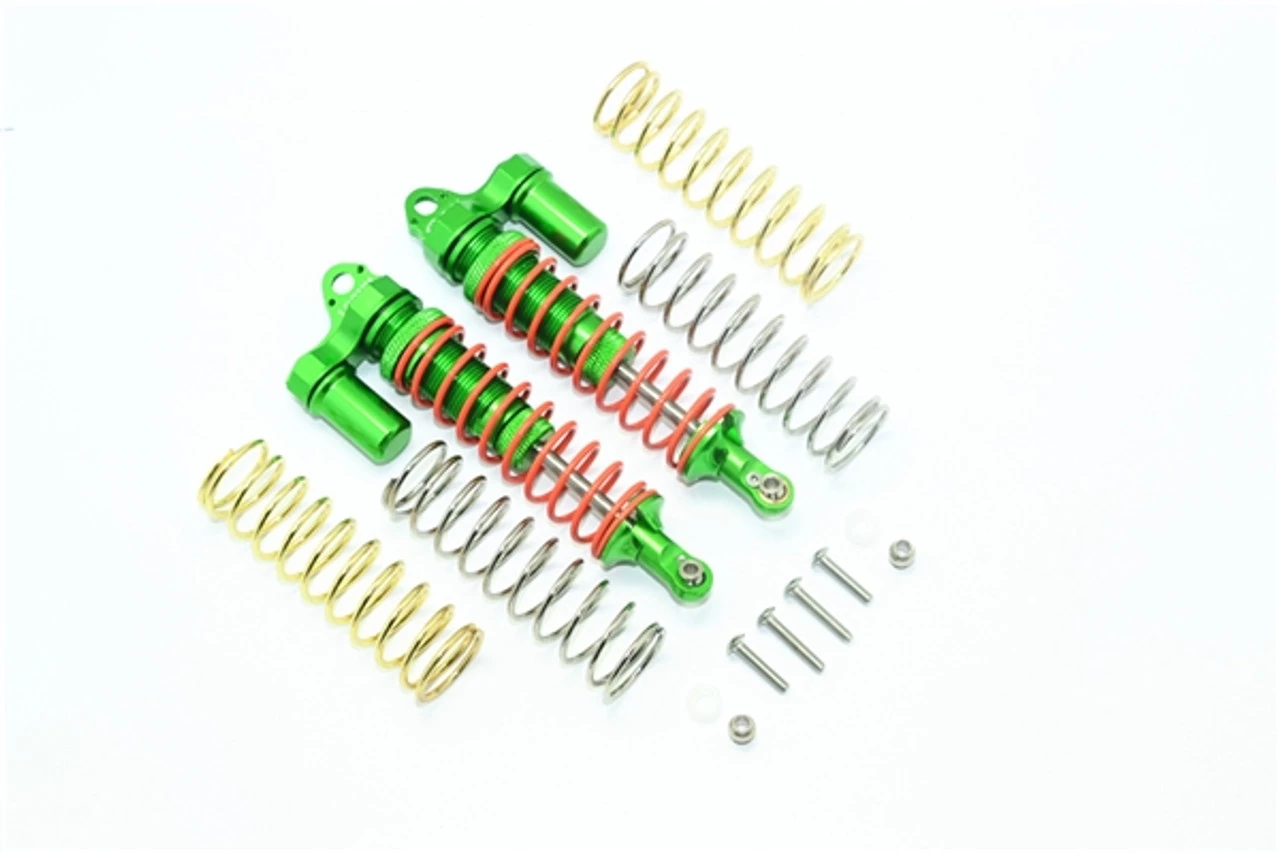 These are the GPM Racing Green Aluminum Adjustable 102mm Piggyback Rear Shocks for Traxxas Slash 4×4, Rustler 4×4, and Stampede 4×4 trucks. Made of 6061-T6 aluminum, with a beefy 4mm steel shock shaft, these are a great upgrade for bashers and show trucks alike. The added oil volume helps keep the oil temp more consistent for less variation in shock performance throughout a run. These feature a threaded shock body with adjuster nut, and include with three sets of springs to adjust the stiffness to suit your driving surface. They are pre-filled with oil, making installation fast and easy!