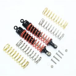 These are the GPM Racing Black Aluminum Adjustable 102mm Rear Shocks for Traxxas Slash 4×4, Rustler 4×4, and Stampede 4×4 trucks. Made of 6061-T6 aluminum, with a beefy 4mm steel shock shaft, these are a great upgrade for bashers and show trucks alike. These feature a threaded shock body with adjuster nut, and include with three sets of springs to adjust the stiffness to suit your driving surface. They are pre-filled with oil, making installation fast and easy!