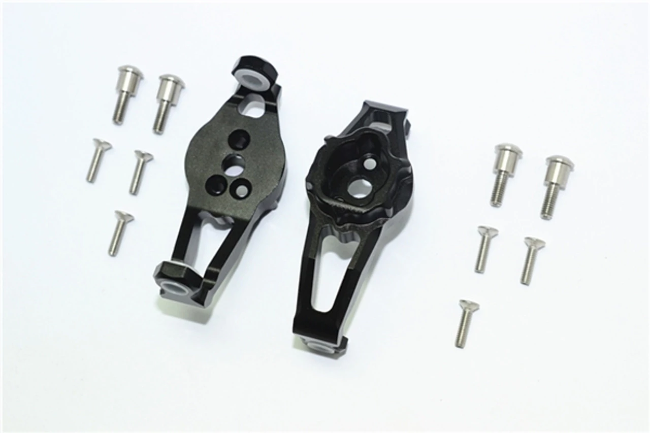 These are the GPM Racing Black Aluminum Front Portal Drive Caster Blocks for Traxxas TRX-4 scale trucks and rock crawlers. Made of 6061-T6 aluminum, these are durable and look great. Stainless steel kingpins and mounting screws are also included.