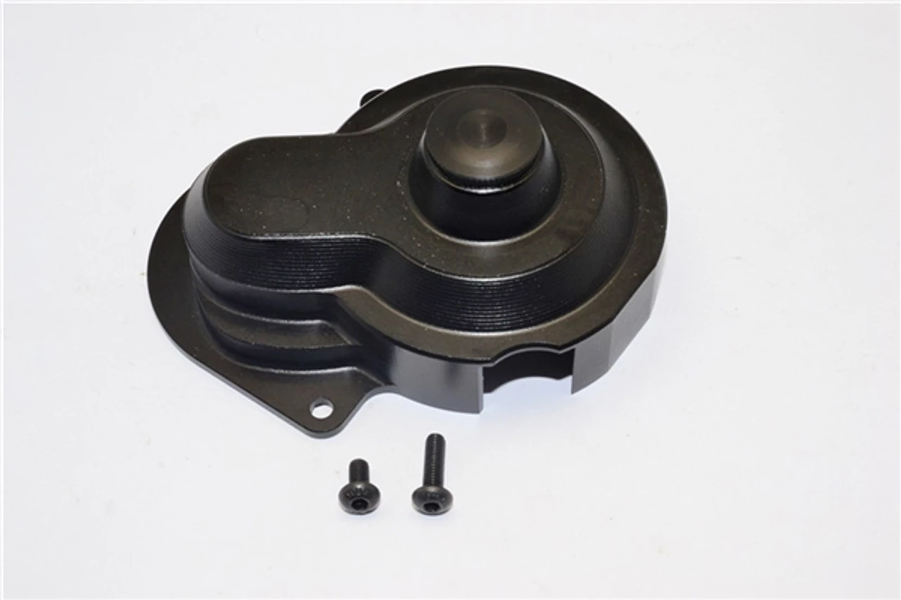 This is the GPM Racing Black Aluminum Transmission & Spur Gear Cover for Traxxas electric Stampede 2WD, Rustler 2WD, Slash 2WD, and Bandit vehicles.