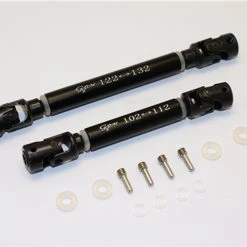 This is the GPM Racing Black Steel and Aluminum Center Driveshaft Set for the Traxxas TRX-4 scale trail trucks and rock crawlers with 12.8″ wheelbases. This heavy-duty design features hardened steel transmission/diff outputs and CV joints, with anodized aluminum center shafts. The telescoping range for the front shaft is 102-112mm and 122-132mm for the rear.