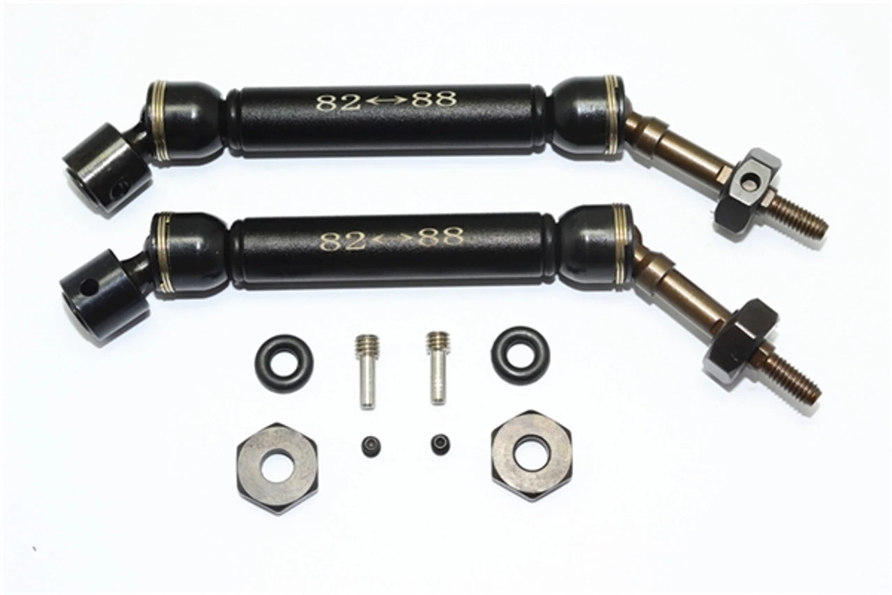 This is the GPM Racing Black Steel and Aluminum Rear CVD Driveshaft Set with 12mm Keyed Hexes for Traxxas 1/10 Slash 4×4, Slash 2WD, Rustler 4×4, Stampede 4×4, and 1/10 Rally VXL vehicles. These feature steel axles and CVD joints, with the main shaft made of aluminum to help reduce weight. The axles and hex hubs are keyed to keep the axles stronger than pinned designs.