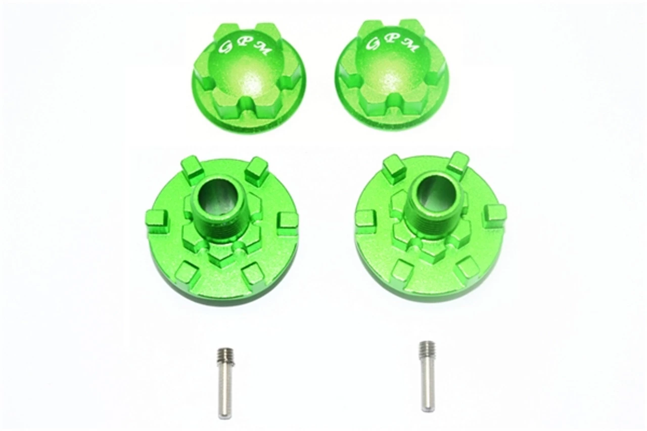 These are the GPM Racing Green Aluminum Wheel Hex Claws and Locking Nuts for the Traxxas E-Revo 2.0 trucks. The design helps support the hub of the wheel for more durability.