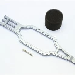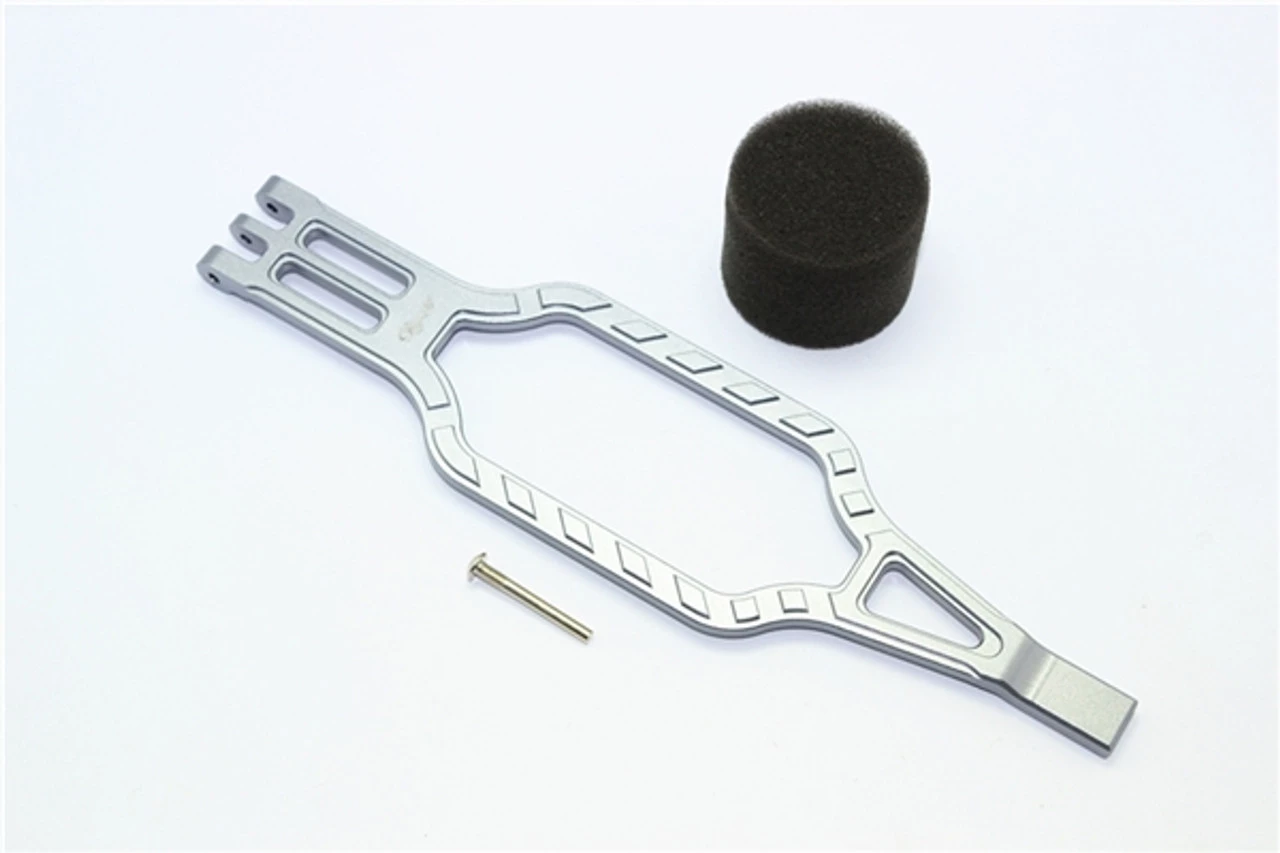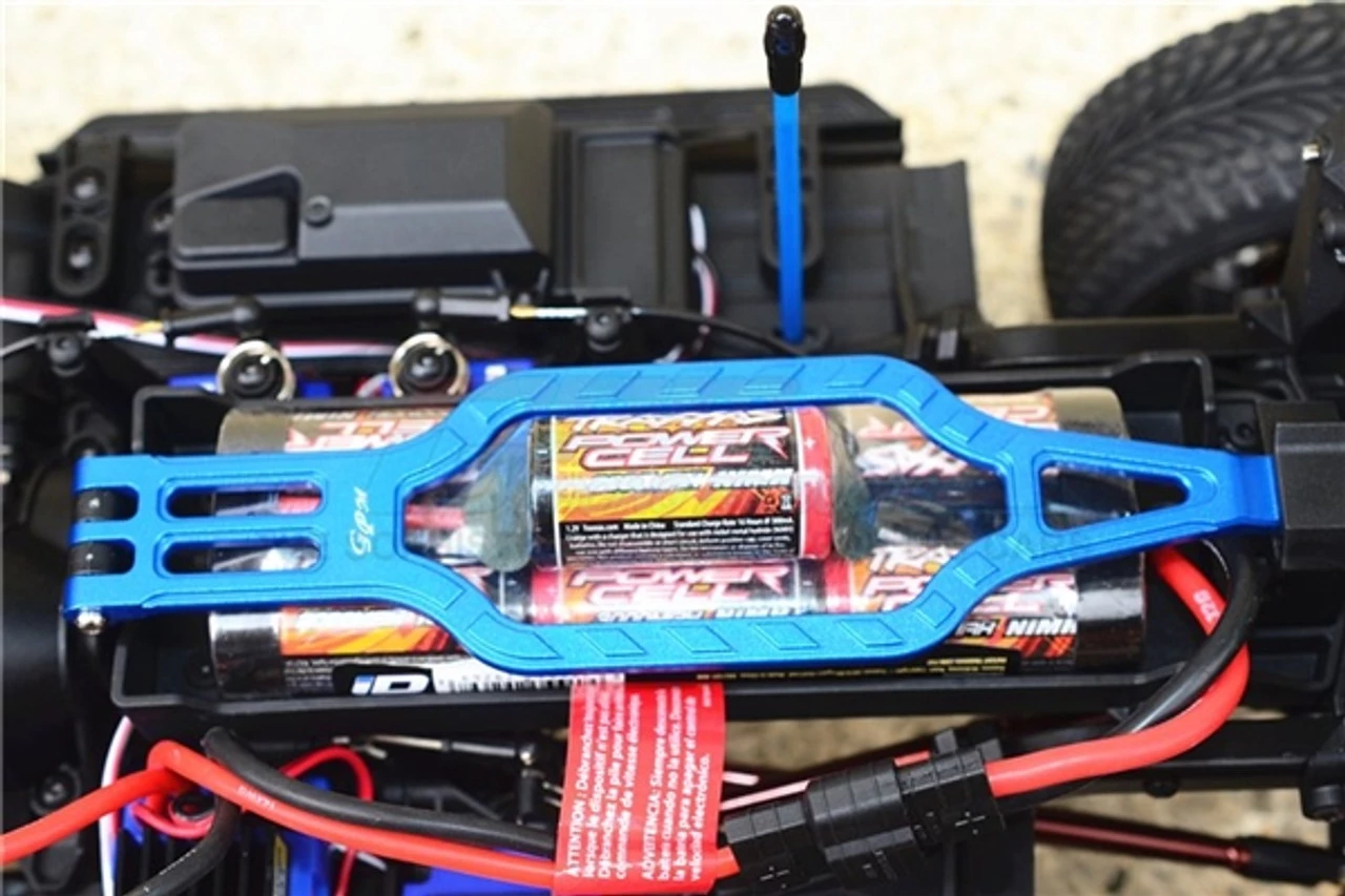 This is the GPM Racing Gunmetal Aluminum Battery Hold Down for the Traxxas TRX-4 scale crawlers and the 4-Tec 2.0 cars. Made of 6061-T6 aluminum with an anodized finish, these look great. Unlike the stock straight battery hold down, these feature an opening to allow running 7-cell hump pack batteries if you want to run those as well.