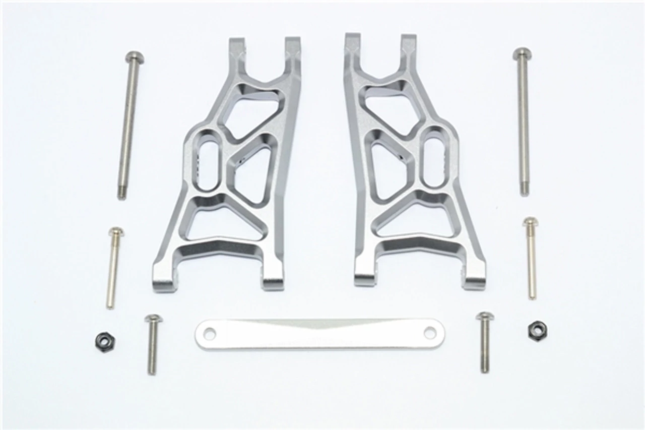 These are the GPM Racing Gunmetal Aluminum Front Suspension Arms for Traxxas Slash 2WD, Rustler 2WD, and Stampede 2WD trucks. Made of 6061-T6 aluminum and anodized for a great looking finish, these are tough and help make your truck stand out. Hinge pins and mounting hardware are included.