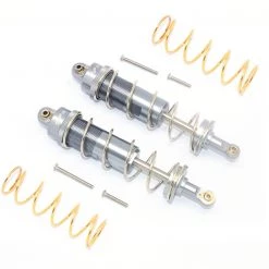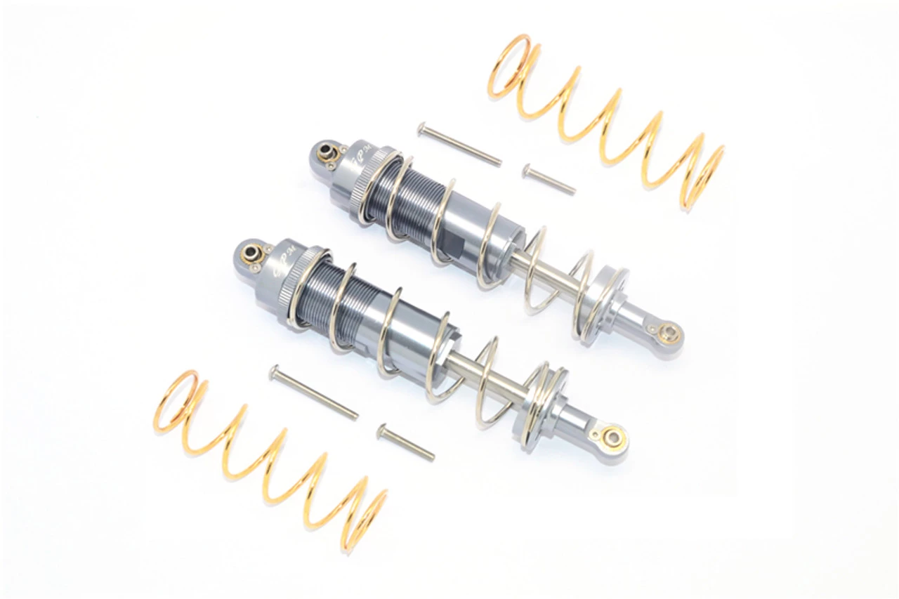 These are the GPM Racing Gunmetal Aluminum Heavy Duty Adjustable Shocks for the Traxxas 1/10 Maxx 4S trucks. Each pack includes 2 complete shocks with mounting screws and two sets of springs. These can be used on the front or rear. Two packages are required to complete the full truck.