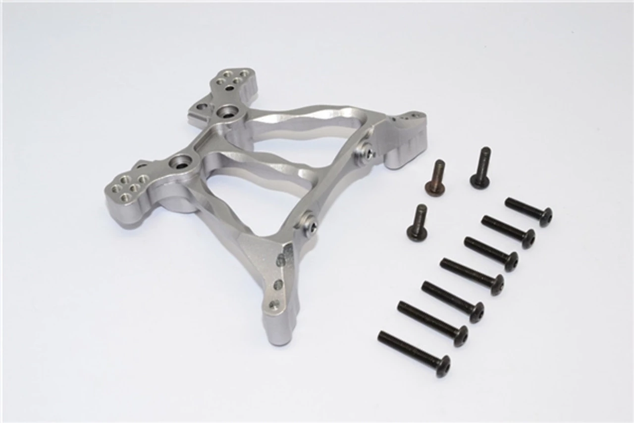 This is the GPM Racing Gunmetal Aluminum Rear Shock Tower for Traxxas 1/10 Slash 4×4, Stampede 4×4, Rally, and Telluride vehicles. Made of 6061-T6 aluminum, these look awesome and improve the strength of your car or truck. Full mounting hardware is included.