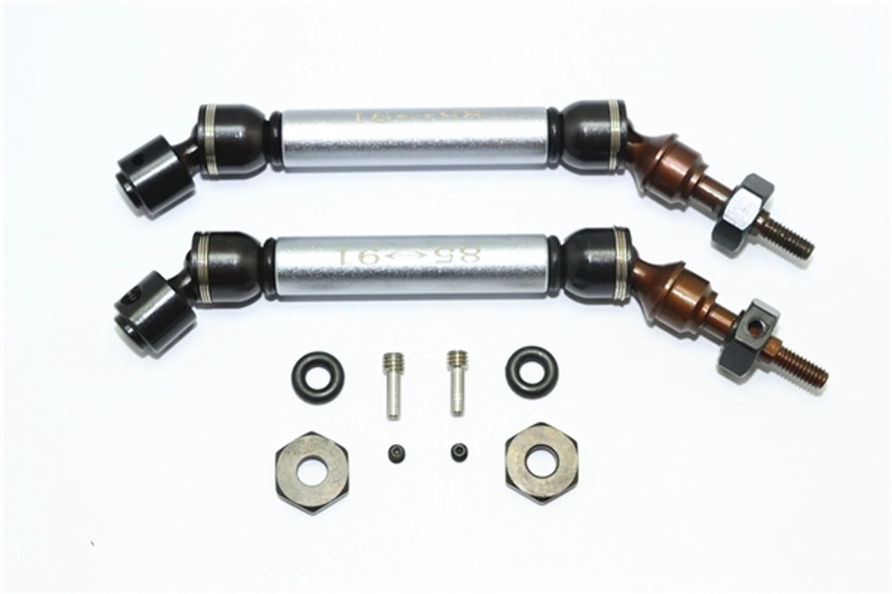 This is the GPM Racing Gunmetal Steel and Aluminum Front CVD Driveshaft Set with 12mm Keyed Hexes for Traxxas 1/10 Slash 4×4, Rustler 4×4, Stampede 4×4, and 1/10 Rally VXL vehicles. These feature steel axles and CVD joints, with the main shaft made of aluminum to help reduce weight. The axles and hex hubs are keyed to keep the axles stronger than pinned designs.
