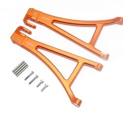 These are the GPM Racing Orange Aluminum Front Lower Suspension Arms with Hinge Pins for the Traxxas E-Revo 2.0 VXL Brushless trucks. Made from 6061-T6 aluminum for strength and durability, then anodized for a stunning finish, these arms are a great way to set your truck apart.