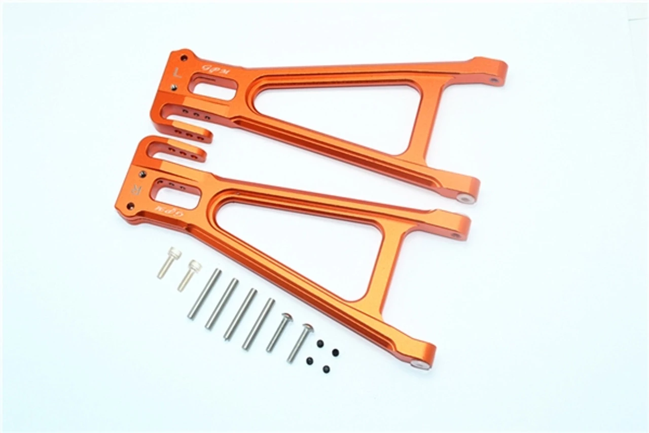 These are the GPM Racing Orange Aluminum Rear Lower Suspension Arms with Hinge Pins for the Traxxas E-Revo 2.0 VXL Brushless trucks. Made from 6061-T6 aluminum for strength and durability, then anodized for a stunning finish, these arms are a great way to set your truck apart.