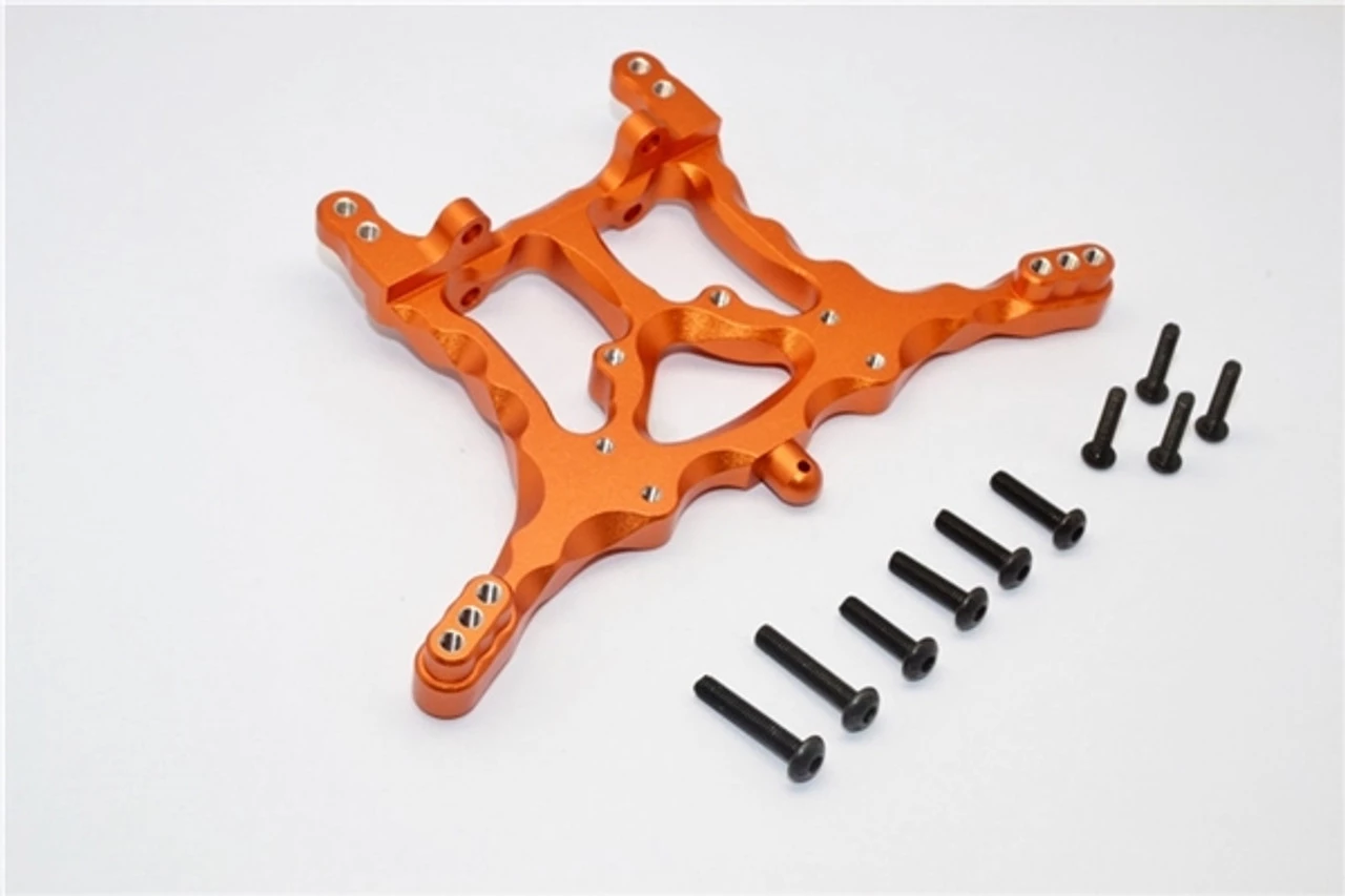 This is the GPM Racing Orange Aluminum Rear Shock Tower for Traxxas electric Stampede 2WD, Rustler 2WD, Slash 2WD, and Bandit vehicles