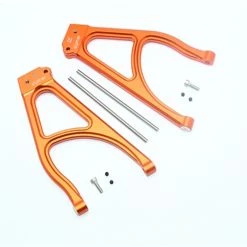 These are the GPM Racing Orange Aluminum Rear Upper Suspension Arms with Hinge Pins for the Traxxas E-Revo 2.0 VXL Brushless trucks. Made from 6061-T6 aluminum for strength and durability, then anodized for a stunning finish, these arms are a great way to set your truck apart.