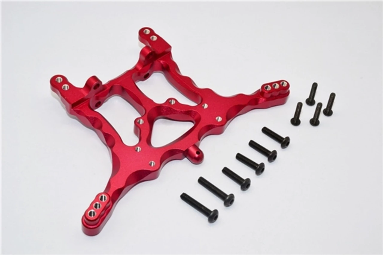 This is the GPM Racing Red Aluminum Rear Shock Tower for Traxxas electric Stampede 2WD, Rustler 2WD, Slash 2WD, and Bandit vehicles