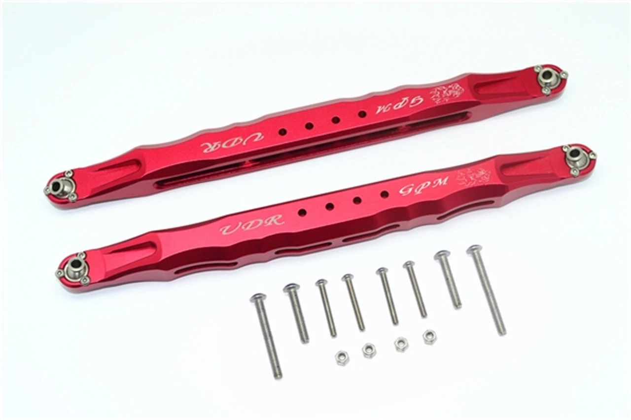 These are the GPM Racing Red Aluminum Trailing Arms for Traxxas Unlimited Desert Racer trucks. Made of 6061-T6 aluminum, these are incredibly durable. Anodized with a color finish, these are perfect on show trucks and off-road monsters alike. They feature multiple shock mount holes for improved adjustability. Stainless steel ball ends are pre-installed at each end for smooth operation. Beef up a weak point on the UDR with these heavy duty arms!
