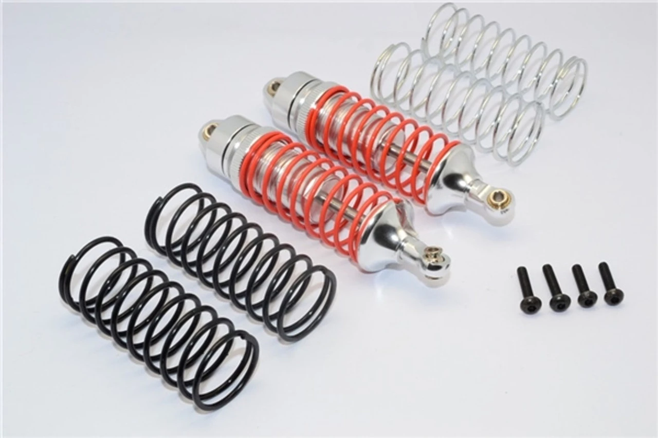 These are the GPM Racing Silver Aluminum Front Shocks for Traxxas 1/10 Slash 4×4, Rustler 4×4, and Stampede 4×4 trucks. Made of 6061-T6 aluminum and with a monster 4mm shock shaft, these shocks are built to last. They include three full spring sets (1.3MM,1.5MM,1.7MM springs), and also feature threaded shock bodies for fine tuning your setup. Mounting screws are included.