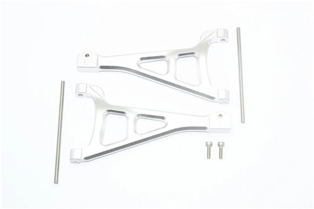 These are the GPM Racing Silver Aluminum Front Upper Suspension Arms with Hinge Pins for the Traxxas E-Revo 2.0 VXL Brushless trucks. Made from 6061-T6 aluminum for strength and durability, then anodized for a stunning finish, these arms are a great way to set your truck apart.