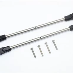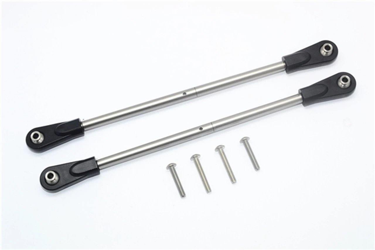 These are the GPM Racing Stainless Steel Adjustable Rear Upper Suspension Links with Ends for Traxxas Unlimited Desert Racer trucks. These are made of 6.5mm stainless steel, versus the stock 4.2mm steel rods. These are built to hold up to the most rigorous racing and bashing! The turnbuckle design makes for simple length adjustment if you need to fine tune the rear suspension.