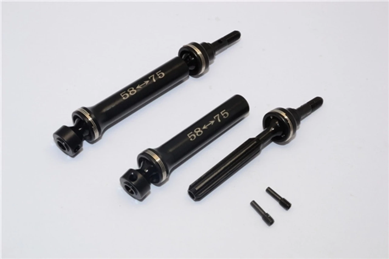 These are the GPM Racing Hardened Steel Front or Rear CVD Driveshafts for Traxxas 1/16 E-Revo and 1/16 Summit trucks. Each pack includes two complete driveshafts and two screw pins. Made of hardened #45 steel, these shafts are incredibly durable and ready for just about anything you can throw at them.