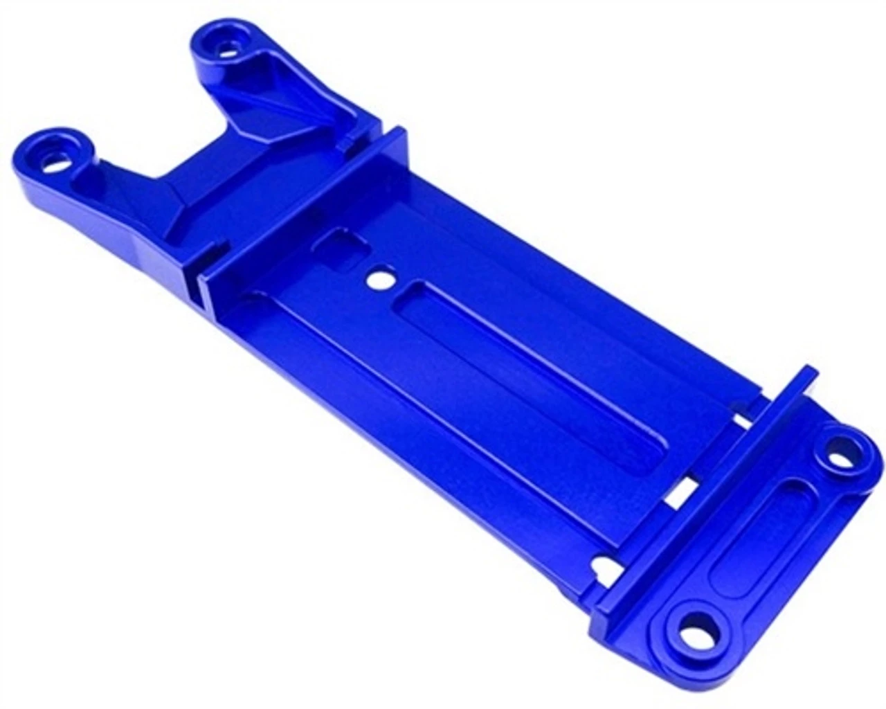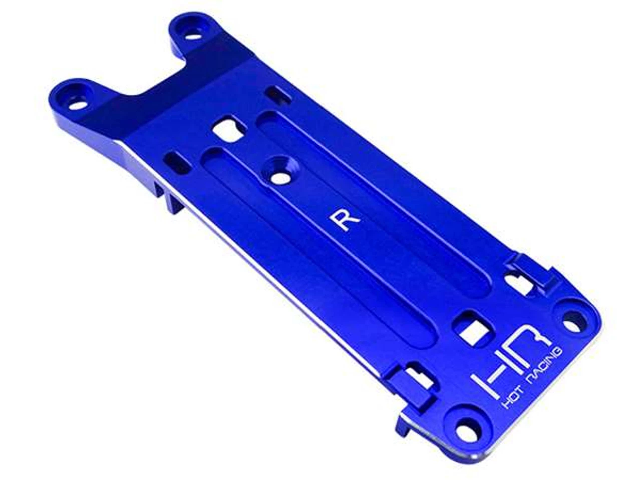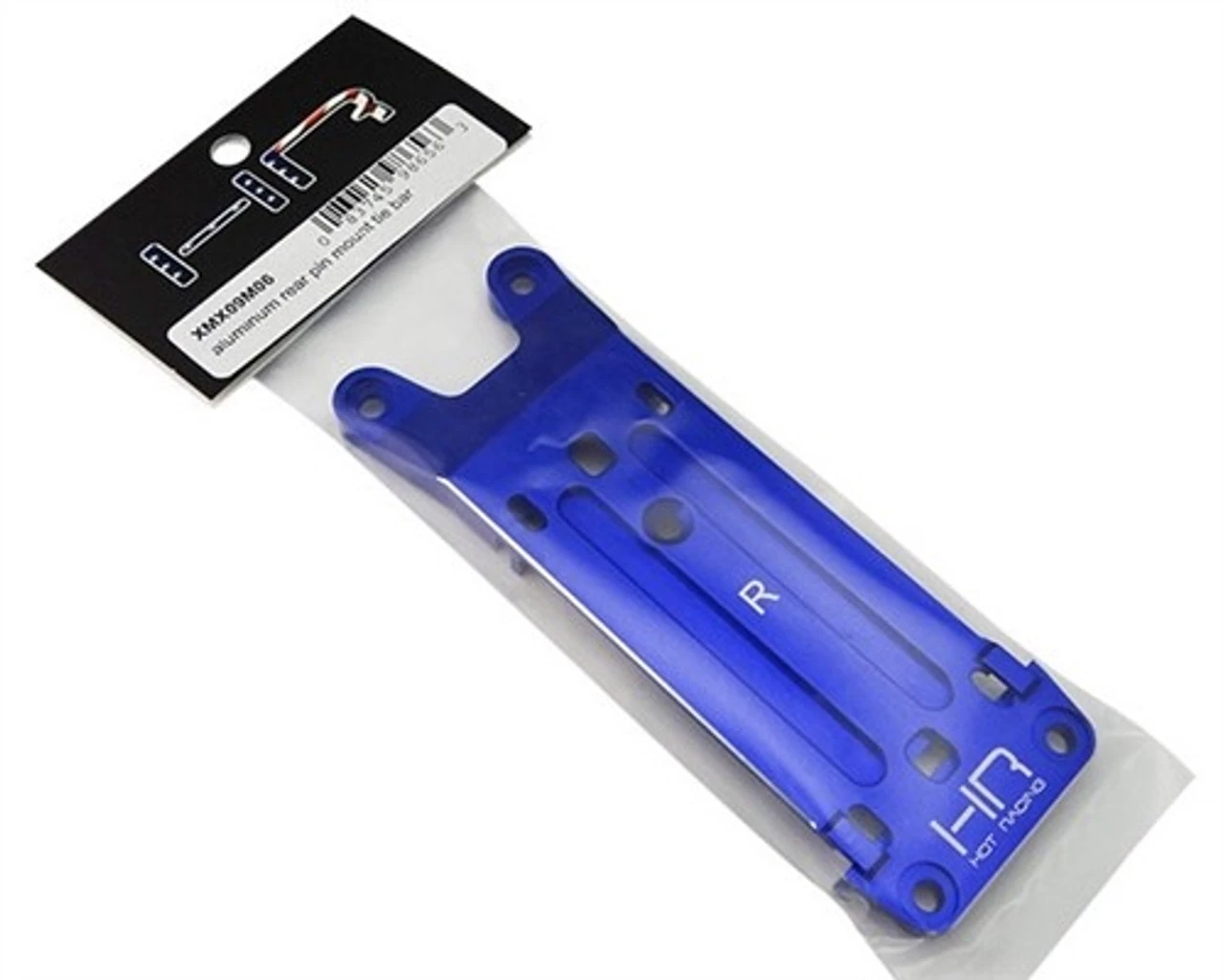 This is the Hot Racing Blue CNC Machined 6061 Aluminum Rear Tie Bar Pin Mount for the Traxxas X-Maxx 6S and 8S monster trucks. This tie bar mount installs between the skid plate and lower rear bulkhead to help hold the lower suspension arm hinge pin assemblies in place. This upgrade is a direct replacement for the factory Traxxas part 7716 / TRA7716.
