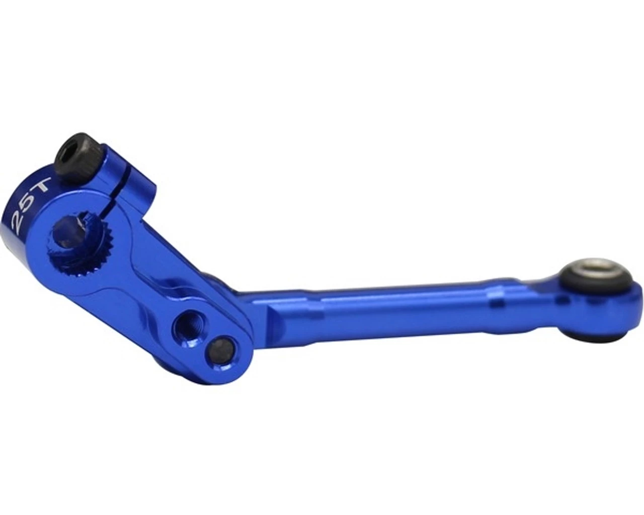 This is the Hot Racing Aluminum Fixed Steering Link with 25T Servo Horn for the Traxxas Unlimited Desert Racer. Machined from 6061-T6 aluminum and anodized in blue, these look great and help stiffen up the steering on the UDR. The clamping servo horn design works with Traxxas servos, as well as aftermarket 25T spline servos from Futaba, Savox, etc.