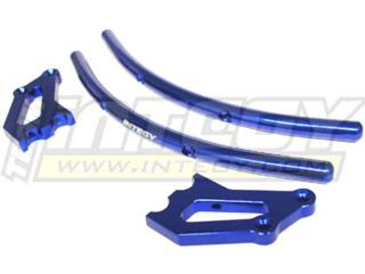 This is an Integy Blue Aluminum Front Bumper Set for use with all Traxxas T-Maxx and E-Maxx trucks. This is a direct replacement and installs with no modifications, and it looks great on these trucks. These are very strong. Whether you are building a show truck or an off-road monster, this aluminum bumper would make a great addition to your truck.