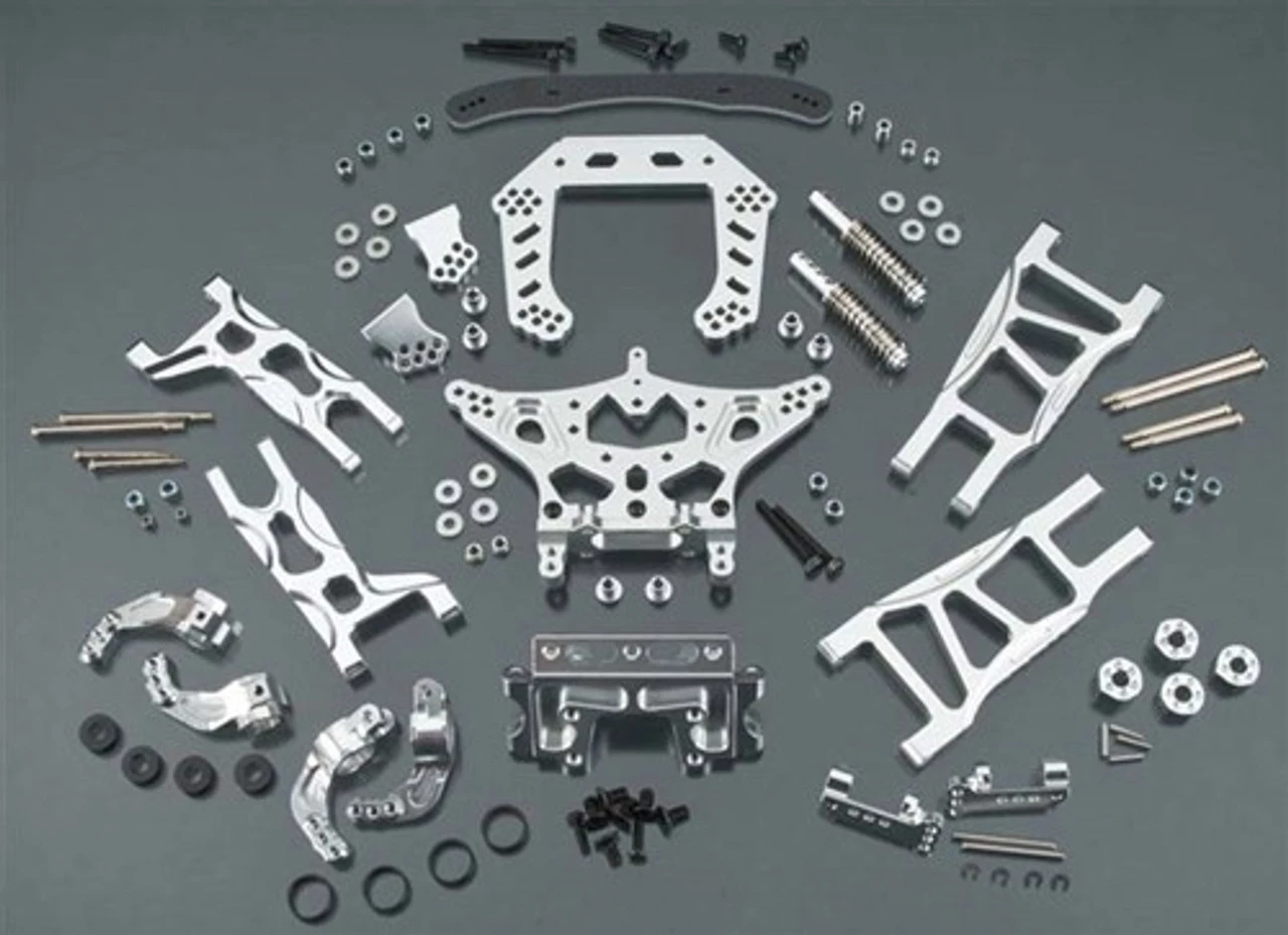 This is the Integy Silver Aluminum Evolution Suspension Conversion Kit for the Traxxas Rustler XL-5 and VXL trucks.