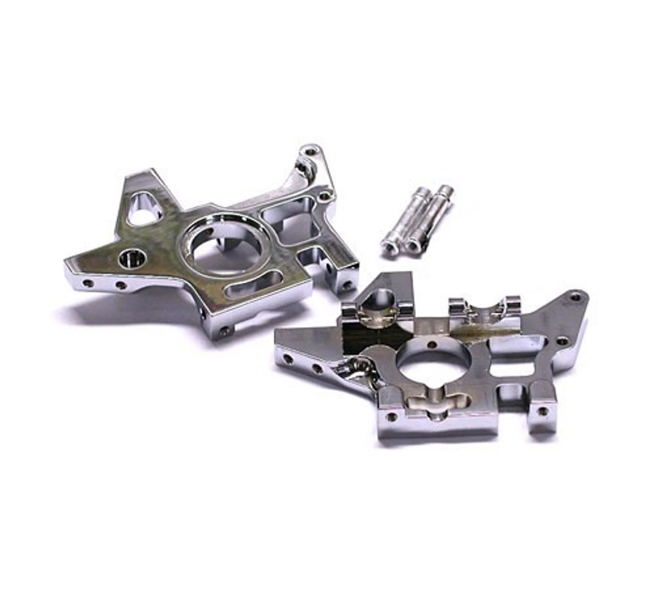 This is the Integy Evolution-4 Aluminum Rear Bulkhead Set with a Chrome finish for all versions of the Traxxas T-Maxx and E-Maxx. These look awesome. They are great for show trucks, and they are extremely durable as well. These are an excellent upgrade over the stock parts. Bulkhead braces are included with this set, making it a strong, direct bolt-on part.