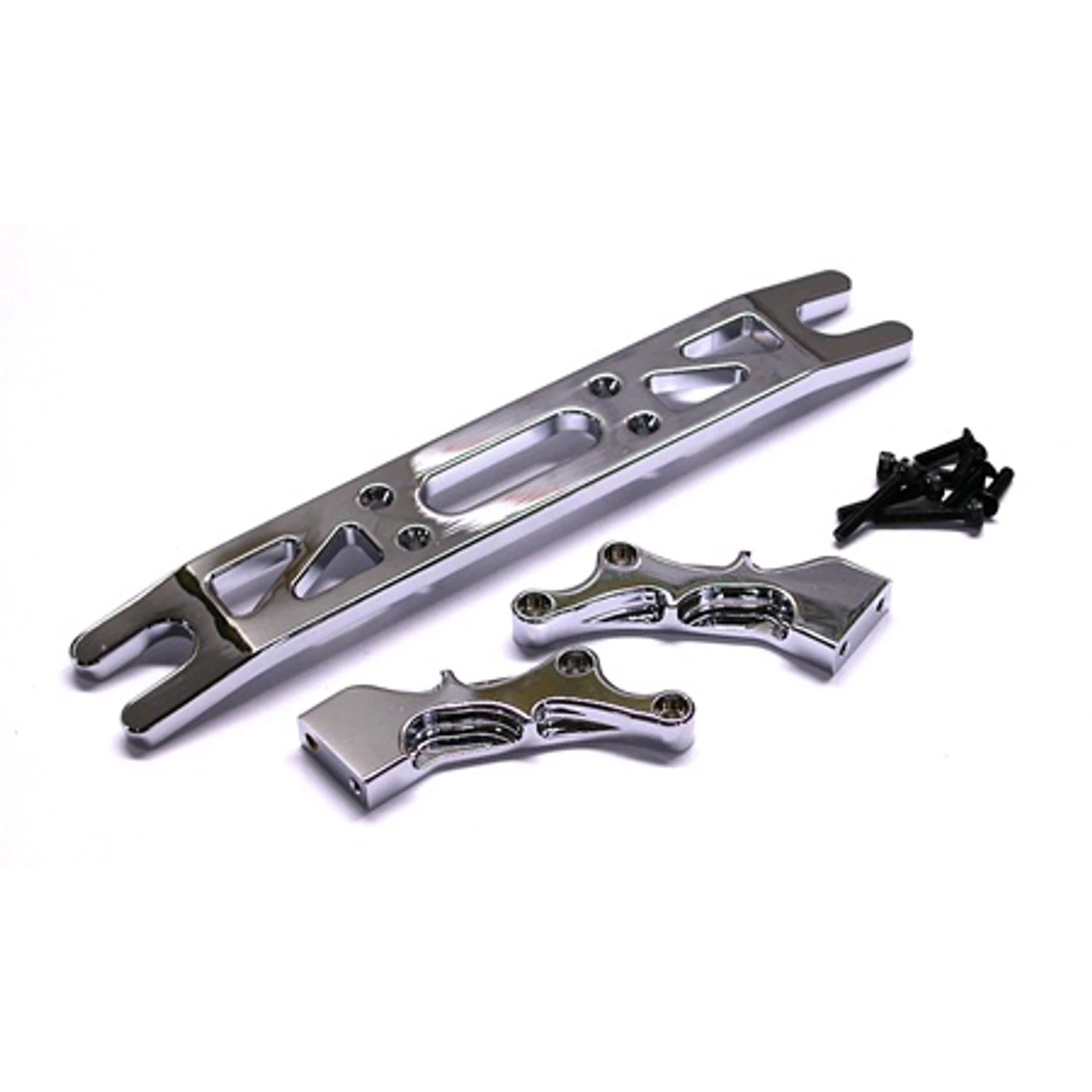This is the Integy Evolution-4 Aluminum Rear Bumper with a Chrome finish for all versions of the Traxxas T-Maxx and E-Maxx. With a beautiful finish like this bumper has, it is a must have item for your show truck. This bumper includes all the required mounting hardware.