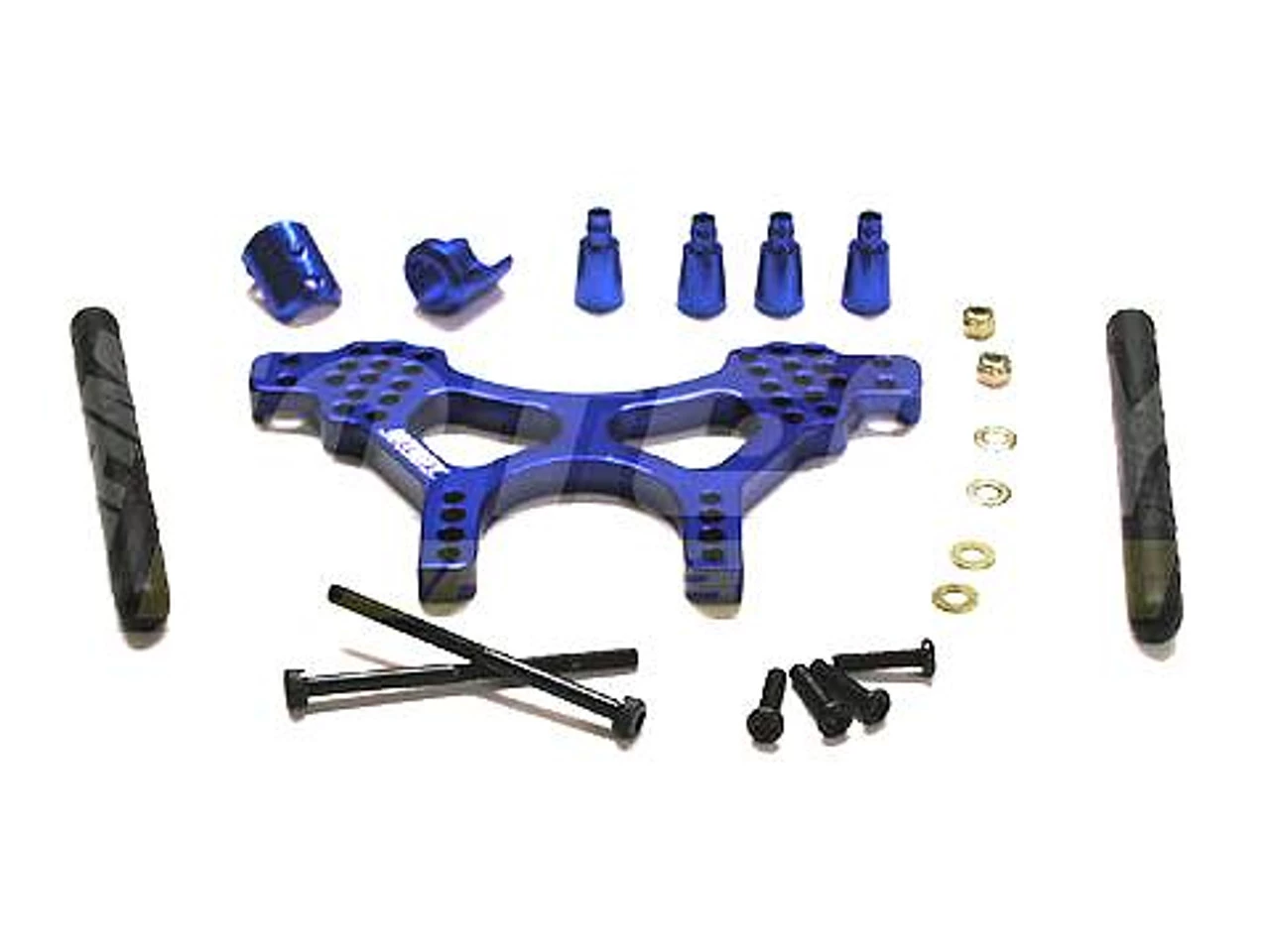 This is the Integy 7075-T6 Blue Aluminum Universal Shock Tower for the Traxxas T-Maxx .15, 2.5, 2.5R, 3.3, and E-Maxx trucks. This will work on the front or the rear of the truck. To upgrade both the front and rear shock towers, purchase a quantity of “2” packages of these. These look great, and they are much stronger than the stock shock towers. They also give you a ton of extra shock mounting positions for better tuning of your truck’s performance.
