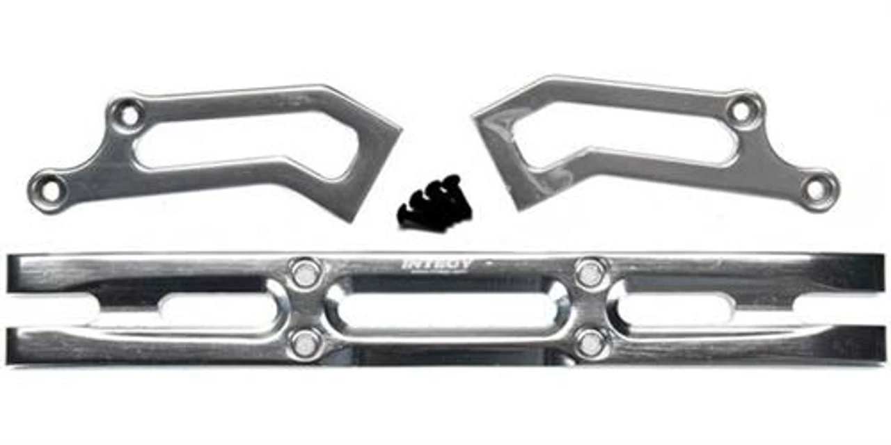 This is the Integy Heavy-Duty Silver Aluminum Rear Bumper for the Traxxas T-Maxx and E-Maxx trucks. It will fit all versions of both the E-Maxx and T-Maxx. This heavy-duty bumper looks awesome, and it is very strong. It looks great on show trucks, but it is built to handle the abuse of off-road driving.