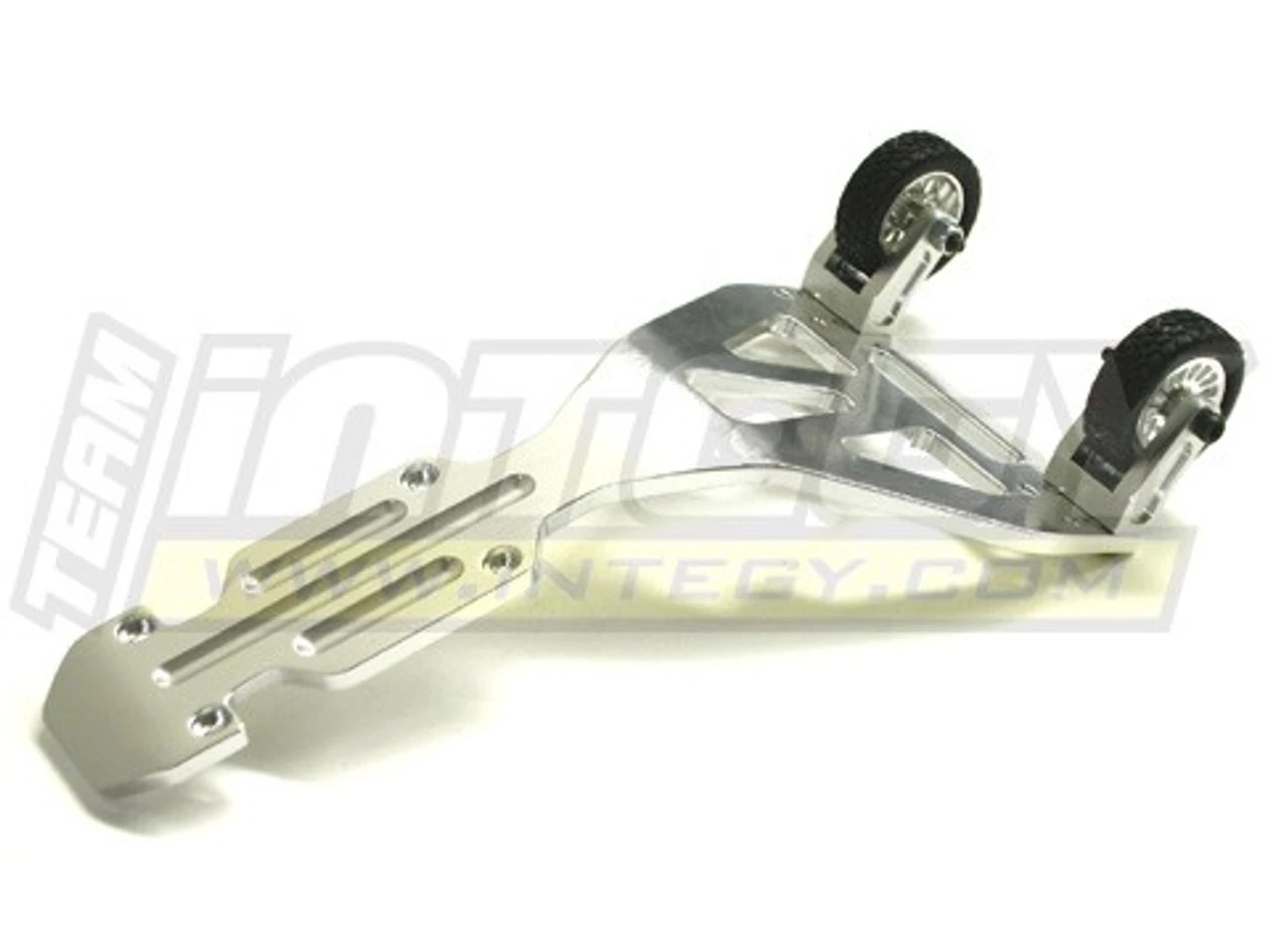 This is the Team Integy Silver Aluminum Heavy-Duty Wheelie Bar for the Traxxas Revo 2.5 and 3.3 trucks. This looks awesome, and it helps prevent your high-performance Revo truck from flipping over backwards onto its lid. This prevents damage to the truck, and it also allows you to ride those crowd-pleasing wheelies! This hop-up part is a direct fit to the Revo trucks.