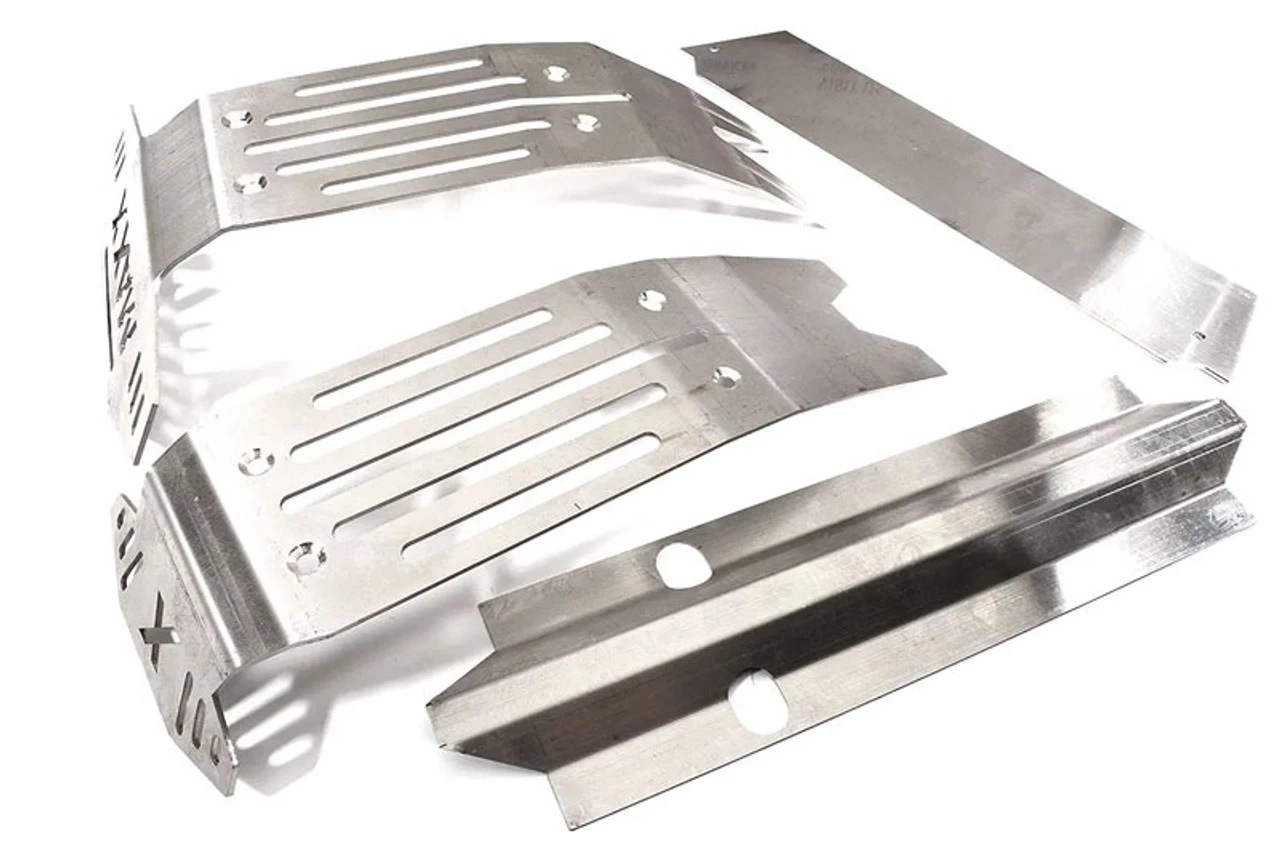 The set includes tough front and rear skid plates (with integrated alloy bumpers) and a 3-piece center chassis skid plate assembly for complete coverage.