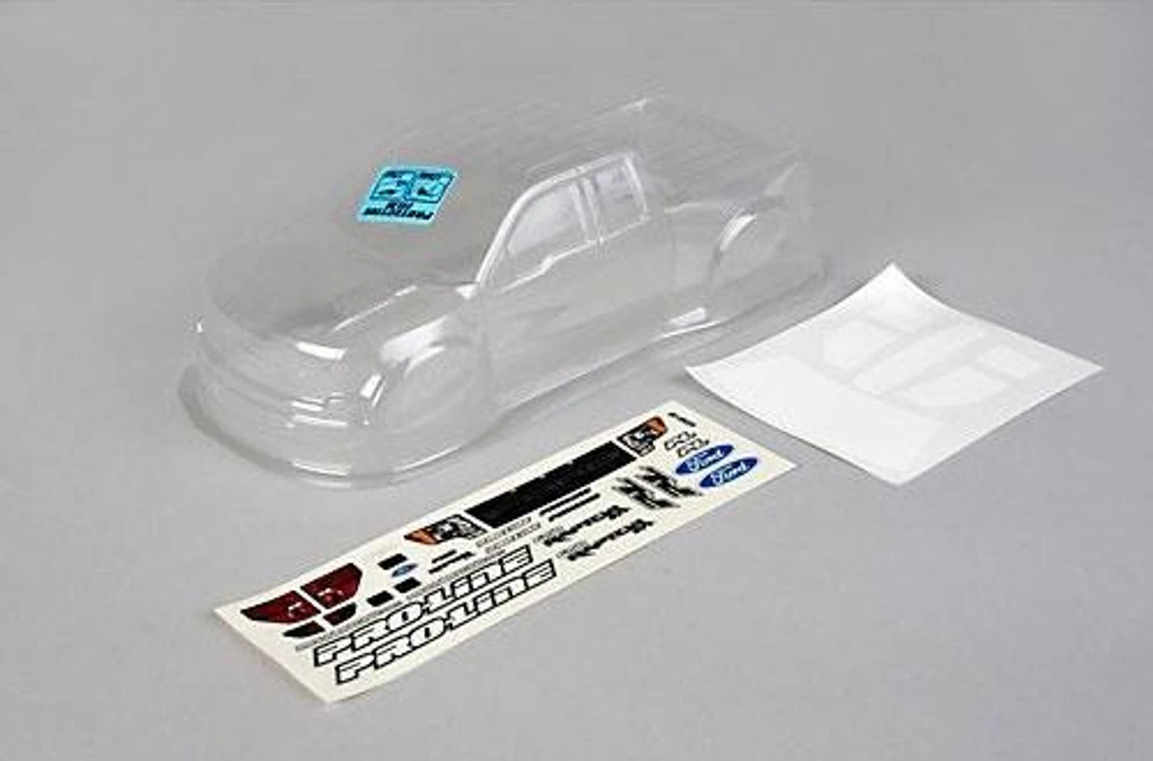 This is the Pro-Line Ford F-150 SVT Raptor body for the Traxxas 1/16 E-Revo trucks (use with wide offset wheels).ย The full-size Ford Raptor SVT was designed for serious off-road abuse and now you can give your 1/16 E-Revo truck the same look!ย The body is supplied clear (unpainted) but is shown painted in the image to better show the shape of the body.