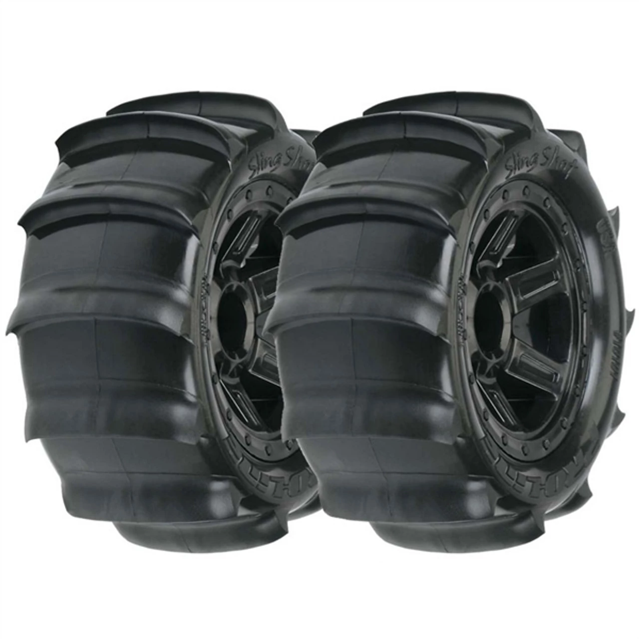 The newest form of fun is here with the release of the Sling Shot 2.2″ paddle tire mounted to Desperado wheels for mini E-Revo & Summit trucks! The Sling Shot provides hours of fun in the sand, snow or even in the occasional mud pit. The 12 paddle design ensures maximum performance due to the true scoop design coupled with low roll outer sidewalls. The Sling Shot comes complete with foam inserts and big Pro-Line fun!