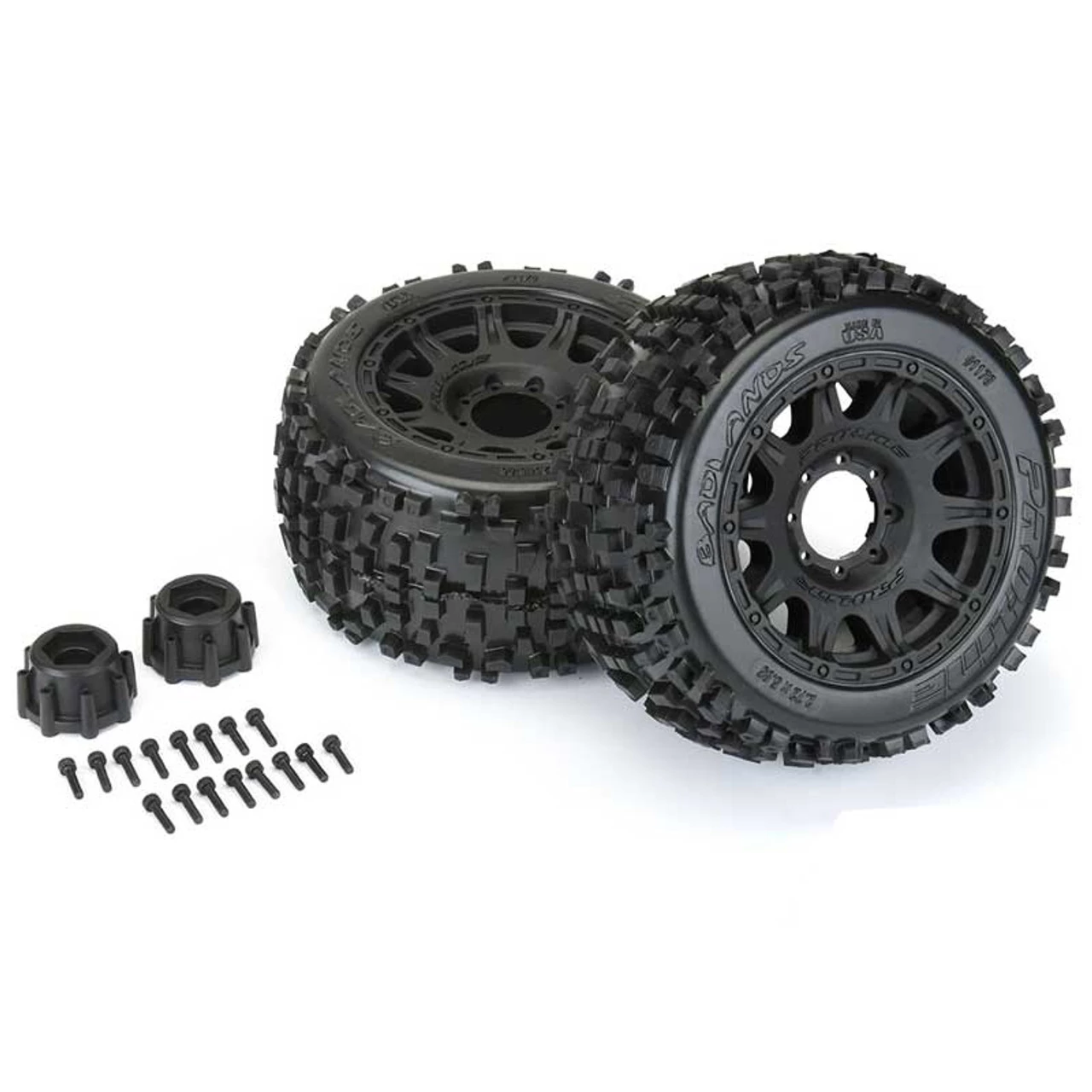 This is a pair of Pro-Line Badlands 3.8 Tires Pre-Mounted on Raid 8×32 Removable 17mm Hex Wheels. These are a great addition to trucks like the Traxxas E-Revo 2.0 and 1/10 Maxx, as well as others with 17mm hexes.