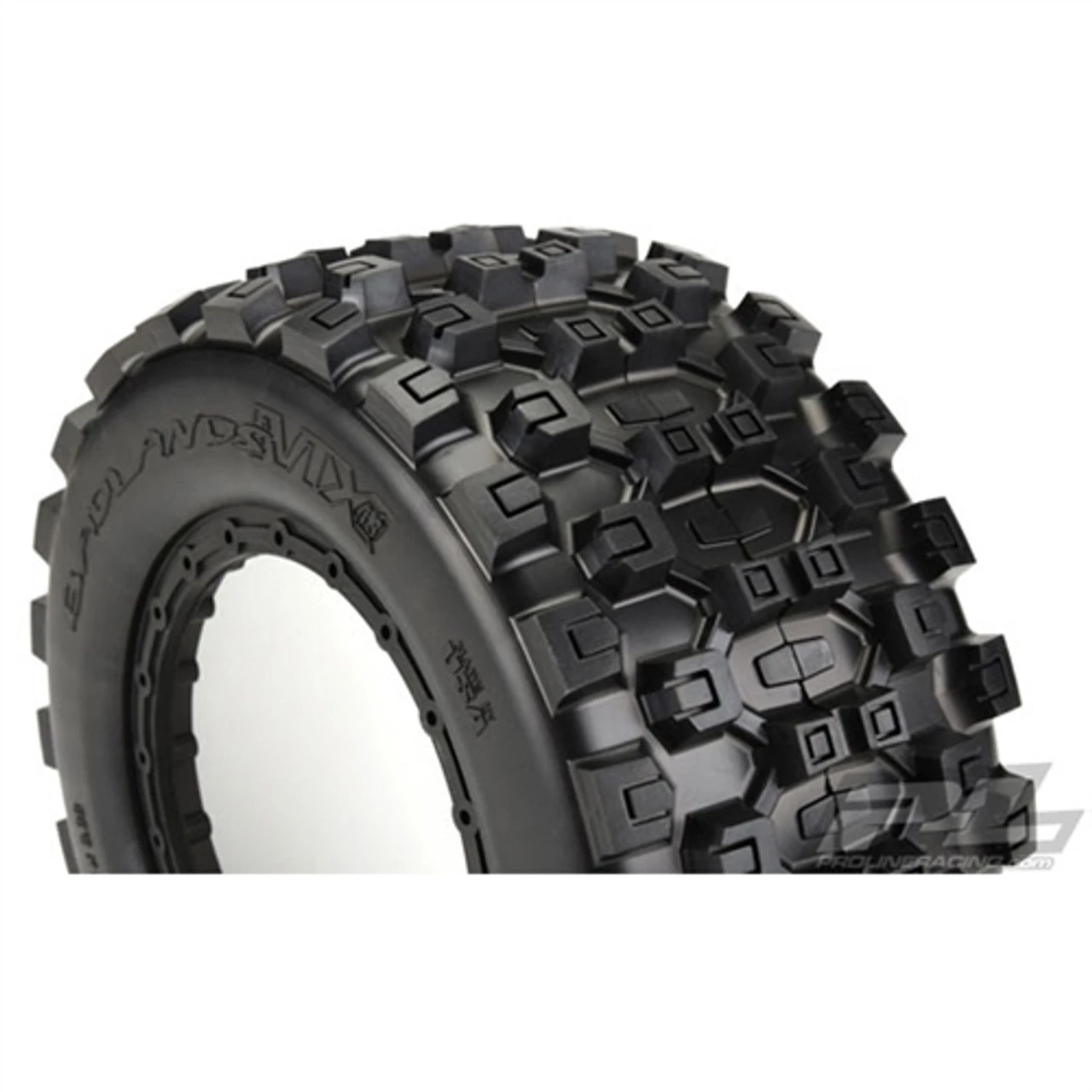 Pro-Line is ready to unleash the long-awaited tire solution for X-MAXX owners with the Biggest and Baddest tire ever conceived: the Badlands MX43! Pro-Line Badlands tires are known for having a sweet Motocross inspired tread and the all-new Badlands MX43 tires kick that up a notch with a Bigger and Bolder knobby tread that matches modern MX tire design. These tires have been developed from the ground up for extreme X-MAXX punishment with an all-new ultra-durable compound that prevents tire ballooning even at high speeds. The Badlands MX43 features Pro-LineÂ’s ground breaking proprietary Pro-Loc Technology that creates an ultra-secure bond to Pro-LineÂ’s Impulse Pro-Loc X-MAXX wheels while still being removable when required. The reinforced Tire bead fits into a uniquely shaped channel on the wheel and the bead-loc screws actually pass through the tire rubber before being pinched by the outer bead-loc ring to create the maximum possible mounting security. The Badlands MX43 is a true All-Terrain tire that will find traction on any surface but is best suited for loose & loamy dirt, mud or grass. Just imagine your X-MAXX throwing up huge rooster tails with these aggressive looking tires!