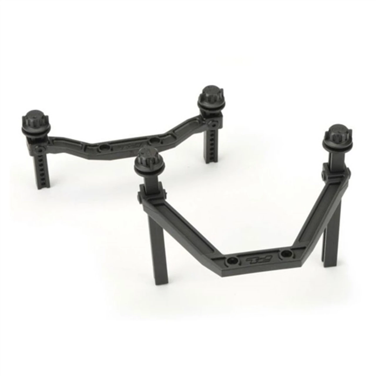 This is the Pro-Line Extended Front and Rear Body Mount Set with Secure-Loc Caps for the Traxxas Stampede 4×4 trucks. Pro-Line continues to innovate with more must-have accessories for your 1:10 Monster Truck. The all-new Pro-Line body mount kit includes adjustable body mounts so you can fit any body on your truck perfectly! But, the Pro-Line Engineers did not stop there. Instead of just using the same old flimsy body clips that always get lost and bent up, the Pro-Line Extended Body Mount kit includes a revolutionary screw on body mounting system for a strong and secure mount every time. No more getting stabbed in the finger by those nasty clips! Just screw down the included setscrew into the body mount, place the O-Ring over the setscrew and mount your body as you normally would, but with the added safety, security and styling of Pro-LineÂ’s innovative screw on body mounting system! Get your Extended Body Mount Kit today!
