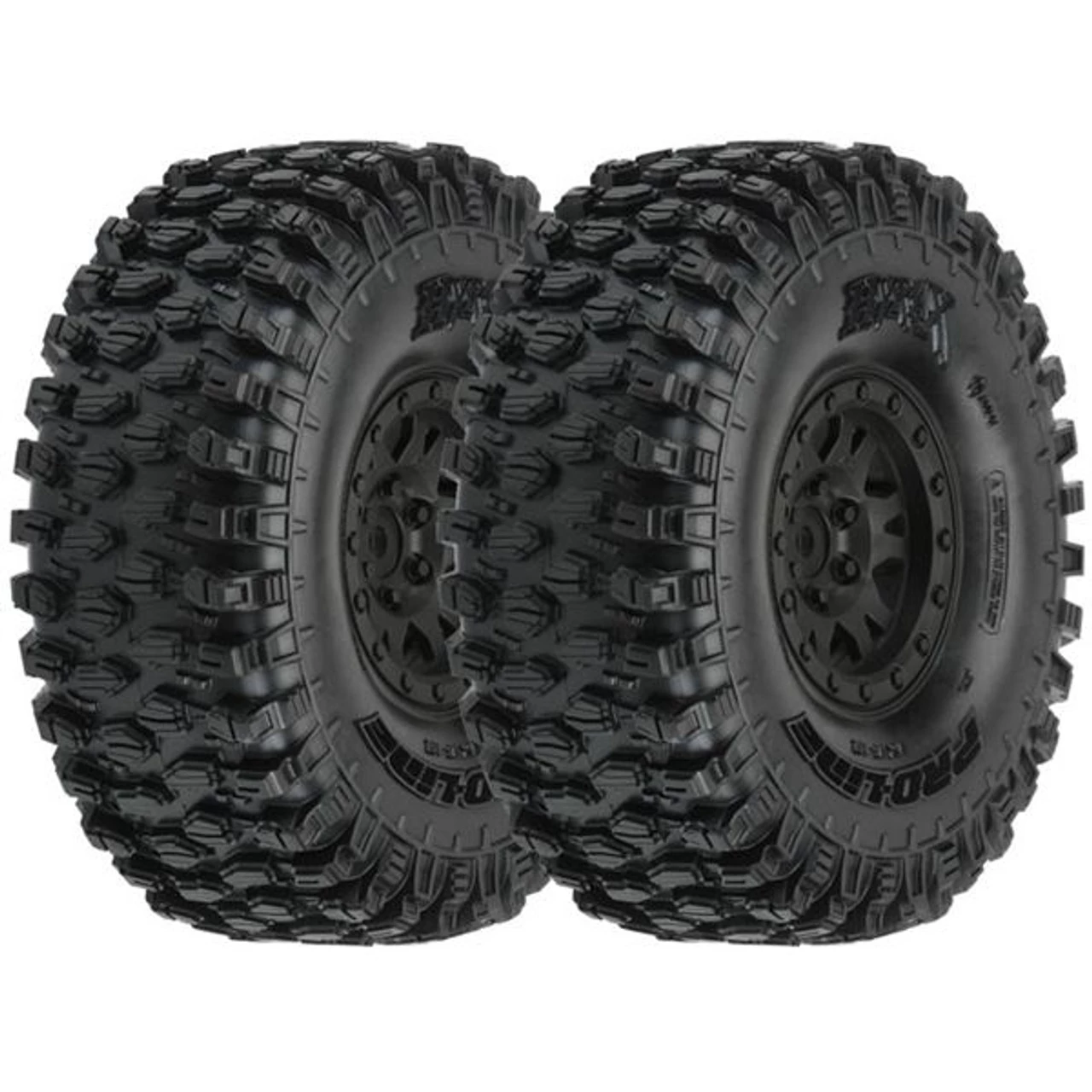 These are the Pro-Line Pre-Mounted Hyrax 1.9 G8 Rock Terrain Tires on Impulse Internal-Bead-Loc Black Wheels with 12mm hexes. The future of 1.9″ Tire Performance has arrived with Pro-Line’s all-new Hyrax Tire!