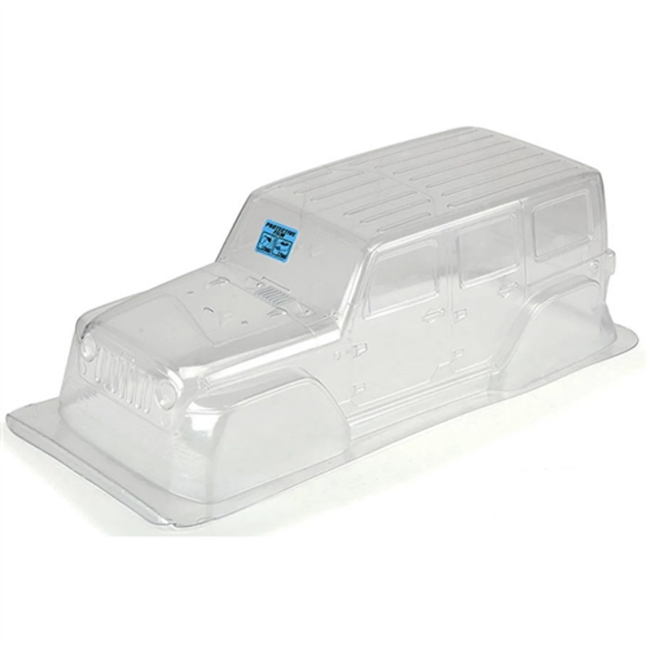 This is the Pro-Line Jeep Wrangler Unlimited Rubicon Clear/Unpainted Body with Decals for Traxxas TRX-4 12.8″ Wheelbase Crawlers.