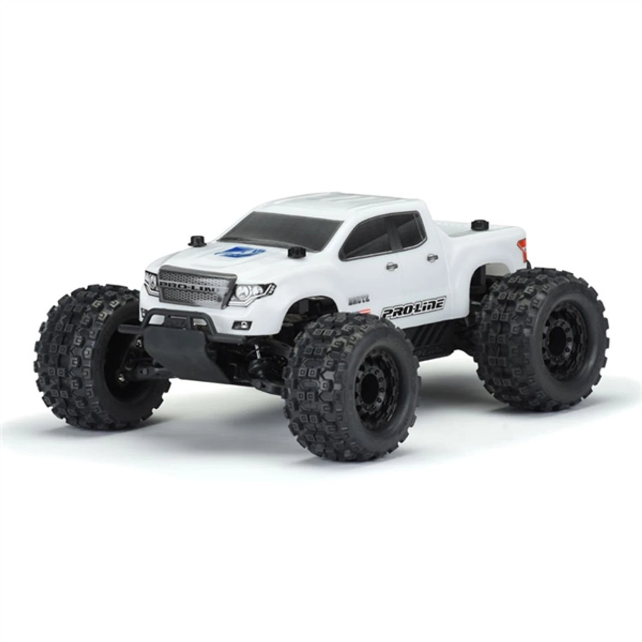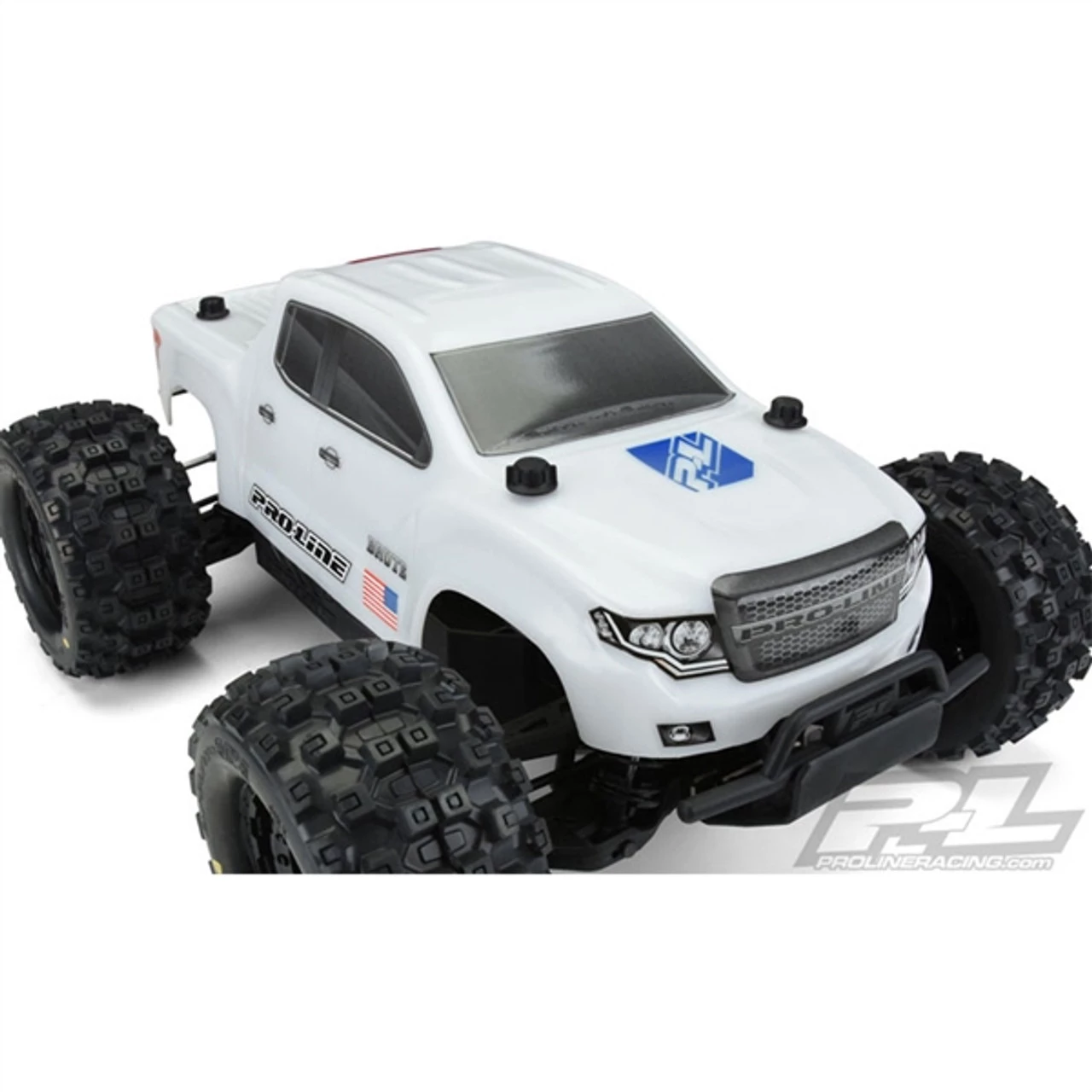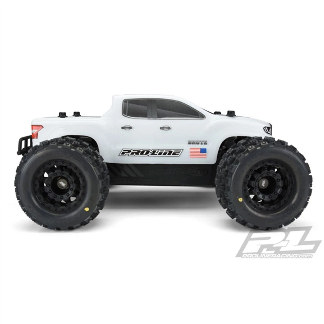 Pro-Line has developed the Ultimate Bash body for your PRO-MT 4×4 & Stampede 4×4 – the pre-cut Brute body featuring Pro-Line’s all-new Bash Armor material! If you are like us, you want a dependable high strength body you can count on for your truck. The Brute Bash Armor White Body has been developed from the ground up to be the toughest body Pro-Line has ever produced. The all-new Bash Armor material is twice as thick as regular 1:10 truck bodies and is ultra-flexible to reduce the chance of cracking and shattering. Unlike clear polycarbonate, the Bash Armor material is White and is not paintable, so Pro-Line includes detailed decal sheets to complete the look. The Brute is Pro-Line’s take on a modern truck and features a bold grill with eye-pleasing body lines sure to turn heads at your local bash spot. If you are ready to battle your buddies, then get the strongest body possible for your truck – the Pre-Cut Brute body with Bash Armor material technology!
