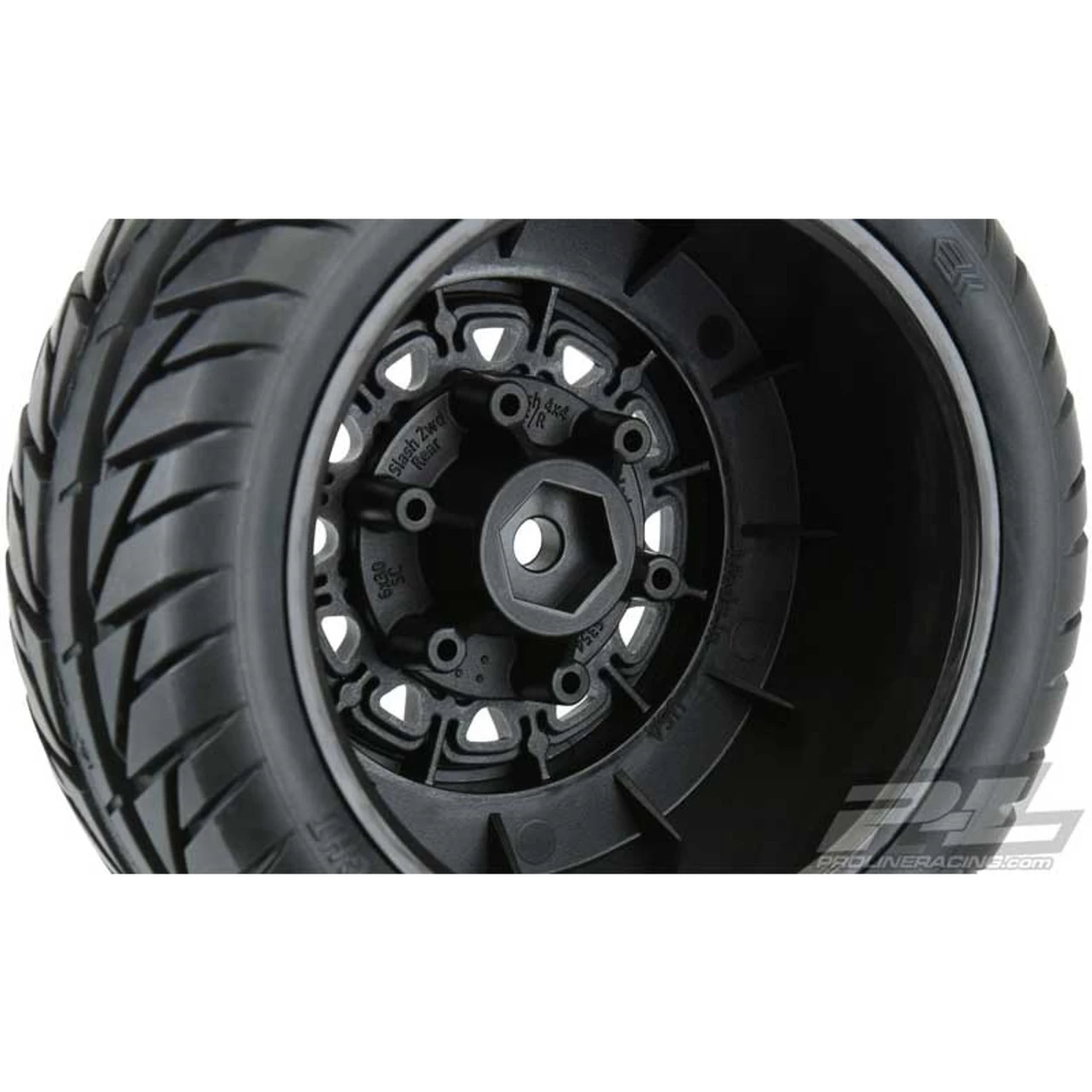 This is a pair of Pro-Line Street Fighter SC Tires on Raid 6×30 Adjustable/Removable 12mm Hex Wheels for Traxxas 1/10 Slash 2WD and Slash 4×4 trucks. These include two sets of center hubs with offsets to make them work on the front or rear of these trucks.