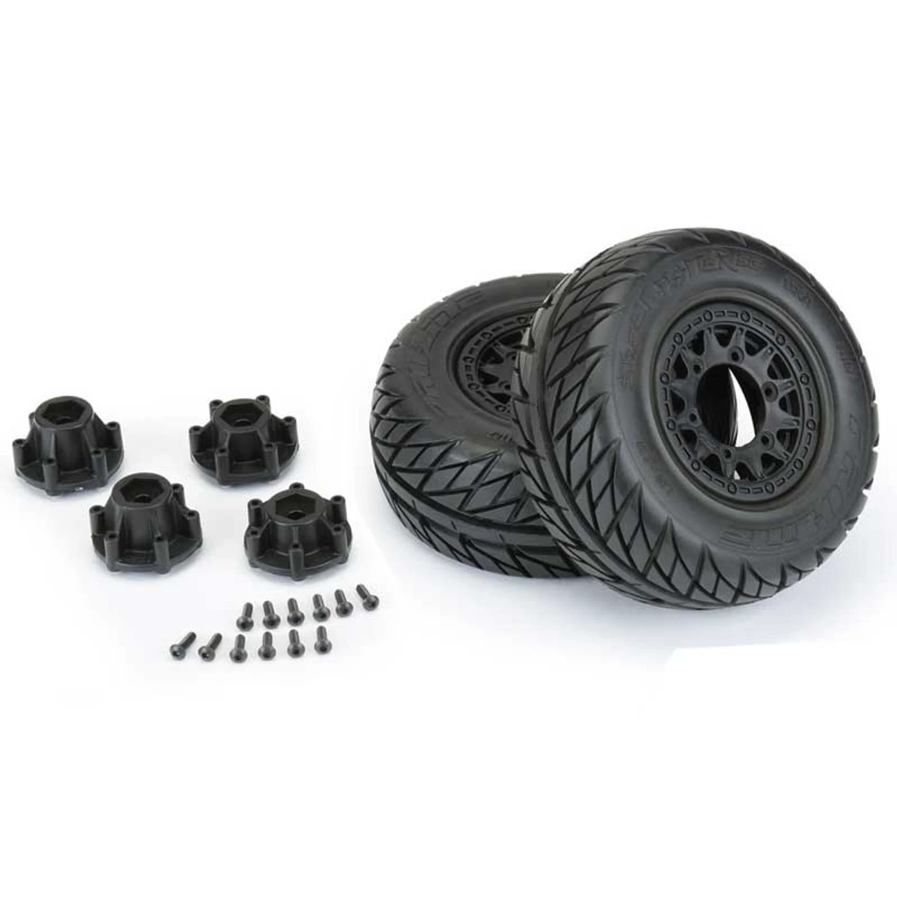The Street Fighter SC tires are mounted to a pair of Raid SC Removable Hex Wheels. We take the guesswork out of your glue job by doing the mounting for you so you can spend your time having fun! Pro-Line is proud to introduce a true next-generation Short Course wheel design – the Raid 2.2″/3.0″ Removable Hex Wheel for all Short Course Tires! Imagine being able to easily change the offset of your wheel to fit different applications by simply changing out the hex! Now you can with the new 6×30 Removable Hex system from Pro-Line. The wheels include a pair of 12mm Slash 4×4 Front/Rear (Slash 2wd Rear) hexes and a pair of 12mm Slash 2wd Front hexes that fit the most popular trucks. Optional 14mm, 17mm and ProTrac offset 12mm hexes (6355-00) are available separately to fit your exact application. If your wheel hex ever gets damaged, it can easily be replaced without needing to replace your glued tires (6354-00 Replacement Slash Hexes)! These new Raid SC wheels accomplish all of this and more by using Pro-Line’s unique 6×30 interlocking hex design that is secured to the wheel by 6 M3 screws that are spaced 30mm across. The built-in adjustability and ease of use make this a new must-have wheel for Short Course Trucks everywhere! Get your new Raid SC pre-mounted tires today!