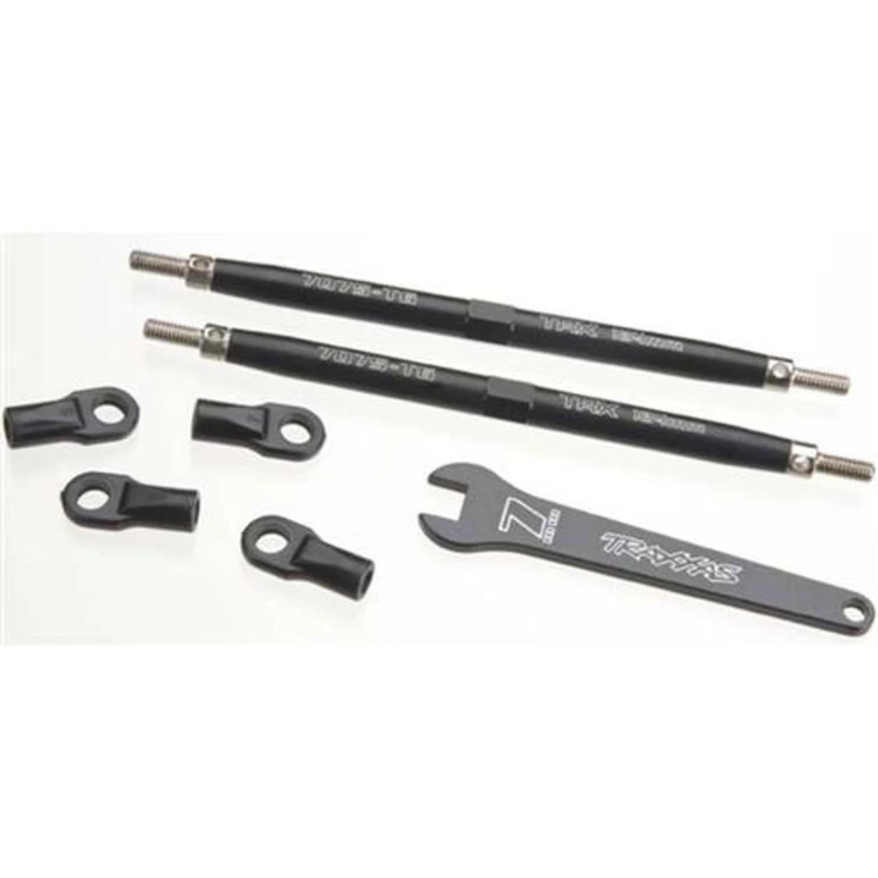 This is a pair of Traxxas 7075-T6 Black Aluminum Rear 124mm Toe Link Tubes with Rod Ends and Wrench for the T-Maxx 2.5R, 3.3, E-Maxx 16.8V, and E-Maxx Brushless trucks with the sealed pivot ball suspension. These are 30% lighter than the stock links, and 4-times stiffer than titanium!