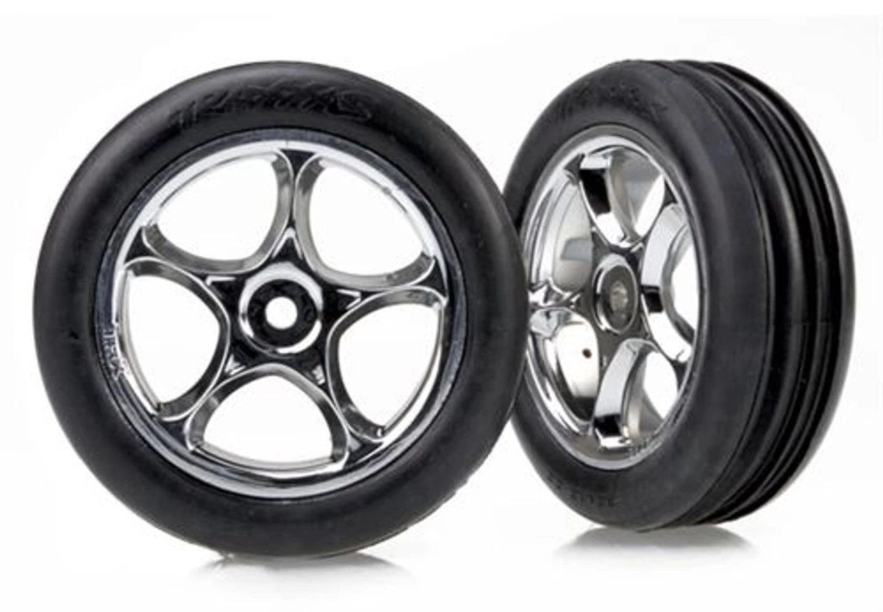 These are the Traxxas Alias Ribbed Front Tires Pre-Mounted on Chrome Tracer 2.2″ Wheels for the Traxxas Bandit XL-5 and VXL buggies. These are soft-compound tires. The wheels have a slot in hub that slides over the pin in the axle.