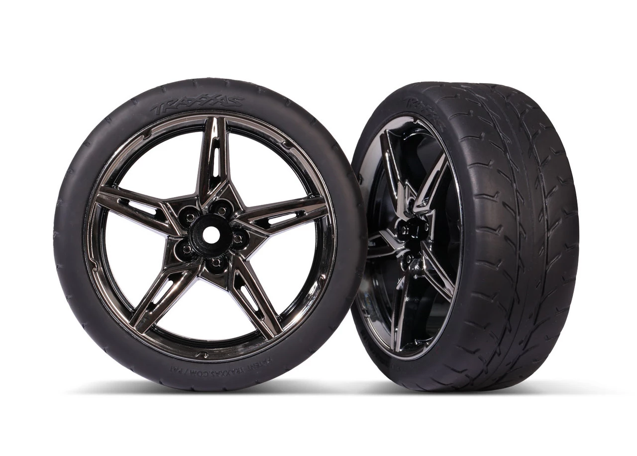 This is a pair of Traxxas Front 2.1′ Response Tires on Split-Spoke Black Chrome Wheels