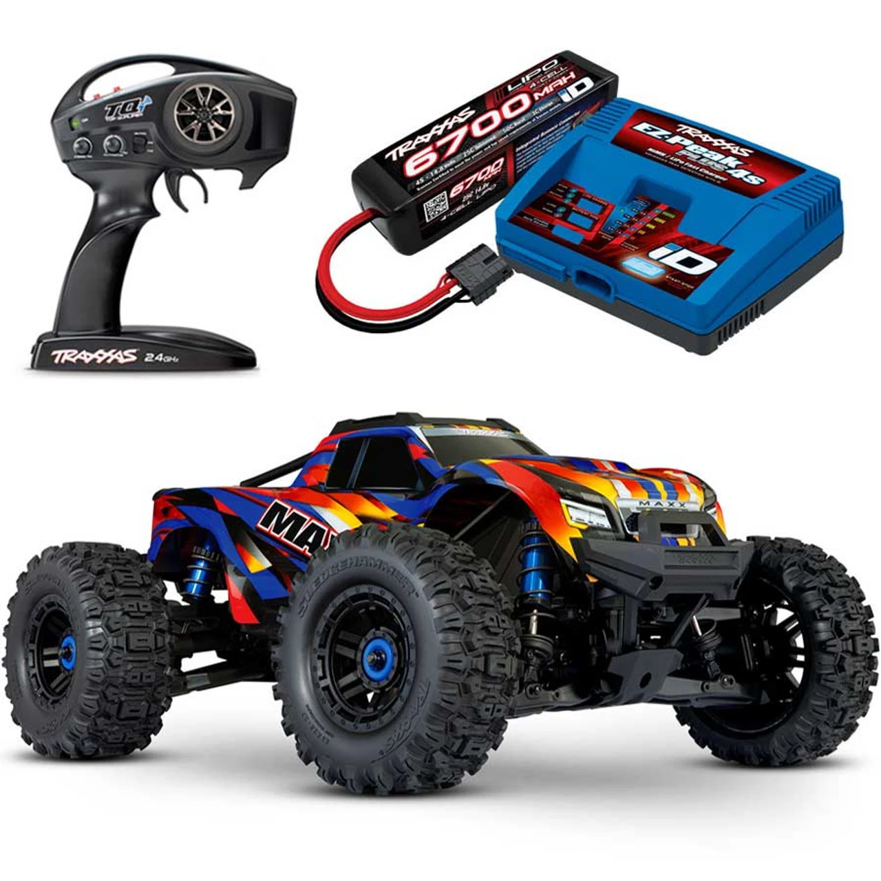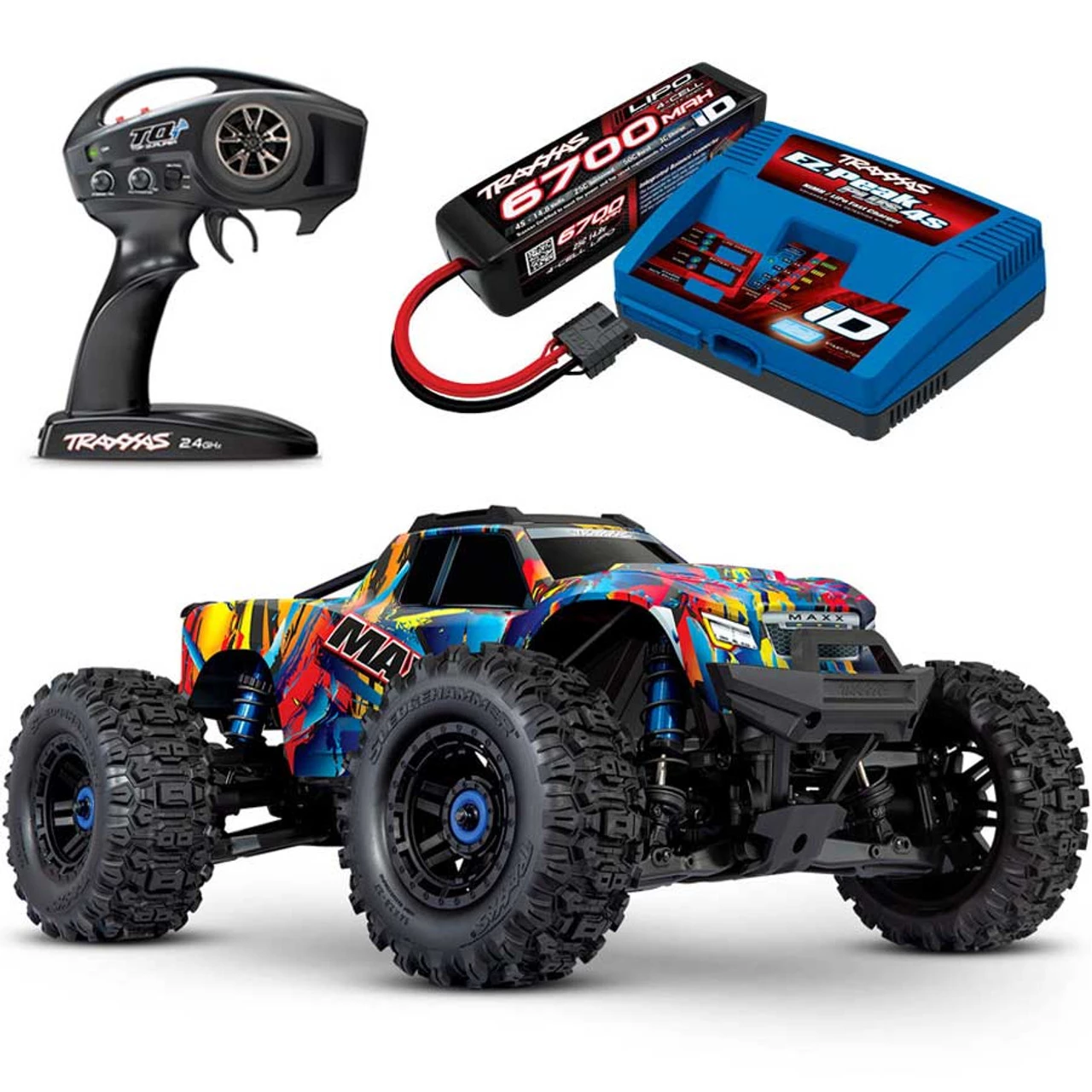 This is the Traxxas Maxx with WideMaxx 4S 1/10 Brushless Ready-to-Race RC Monster Truck LIPO COMBO PACKAGE with TQi Radio System and TSM Stability Management. With 4S capability, the Maxx can do 60+MPH and bash just like it’s big brother.
