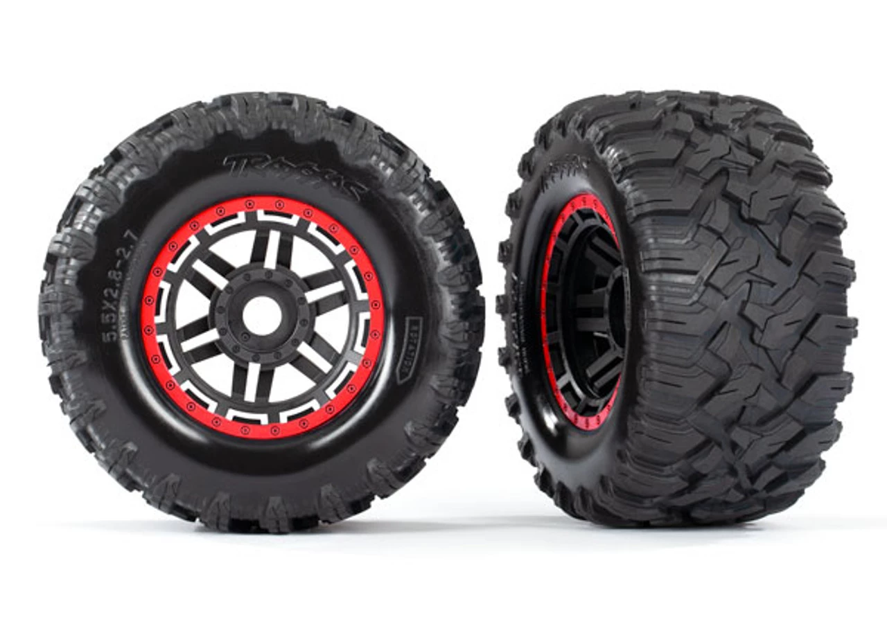These are the Traxxas Maxx MT Tires on Black Wheels with Red Beadlock Look and 17mm Splined Hexes (2)