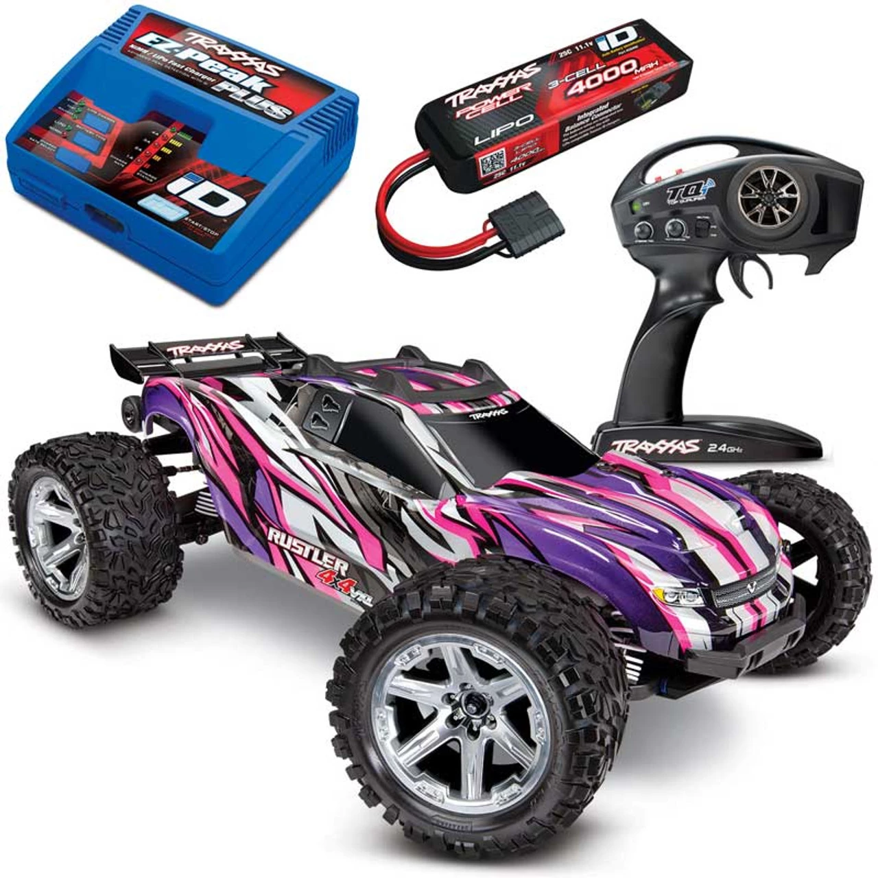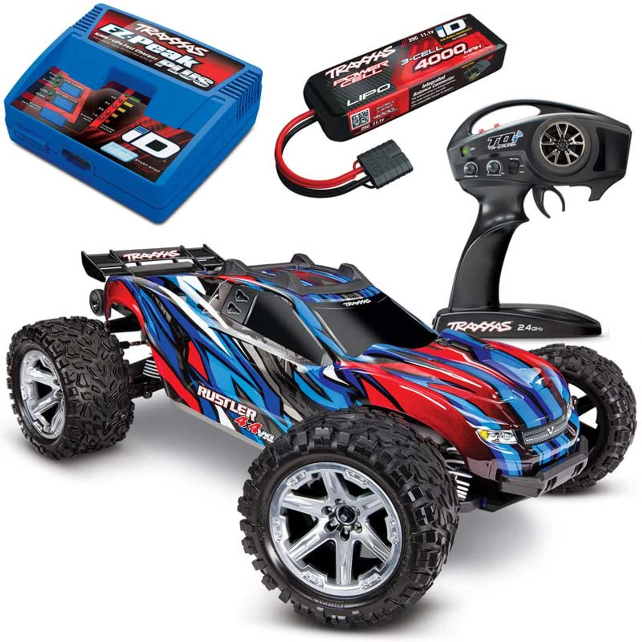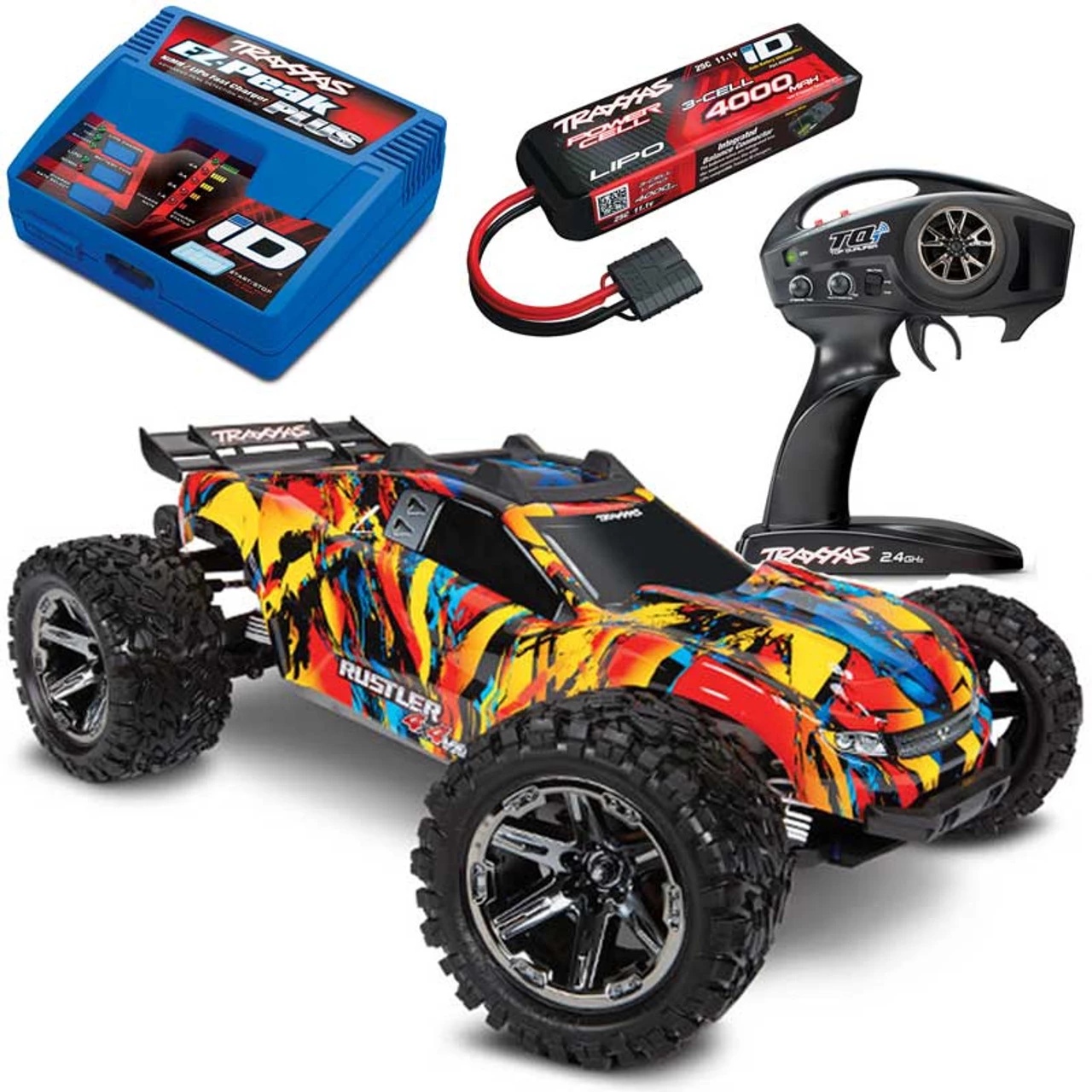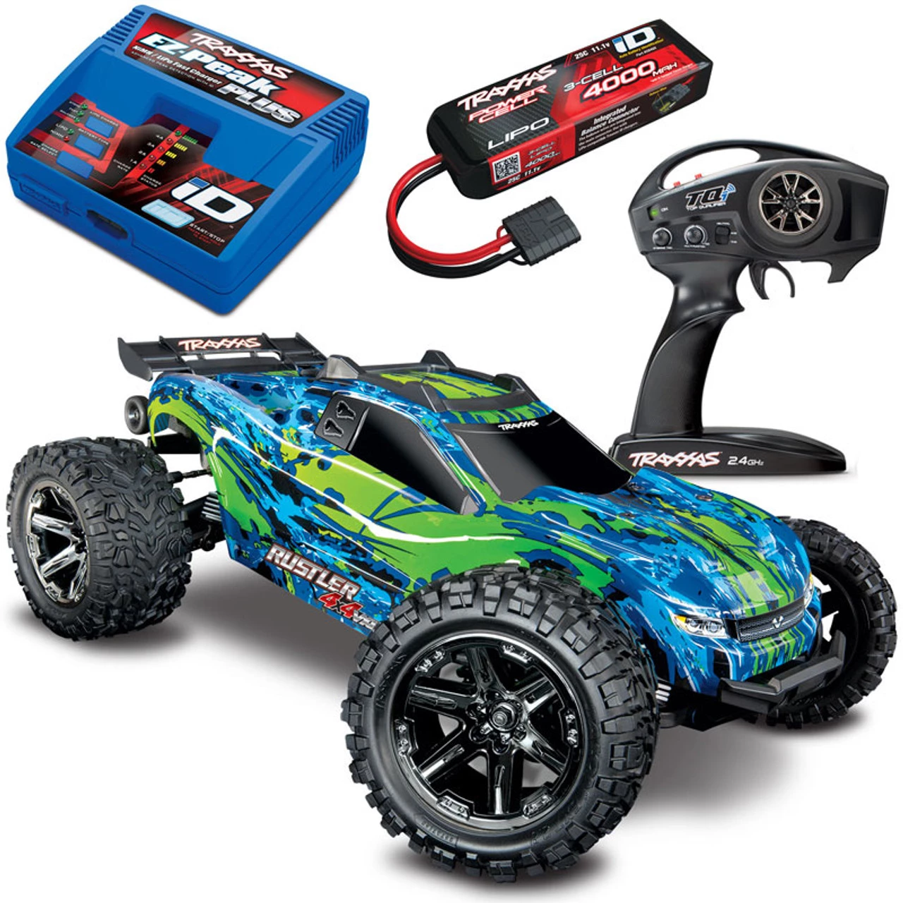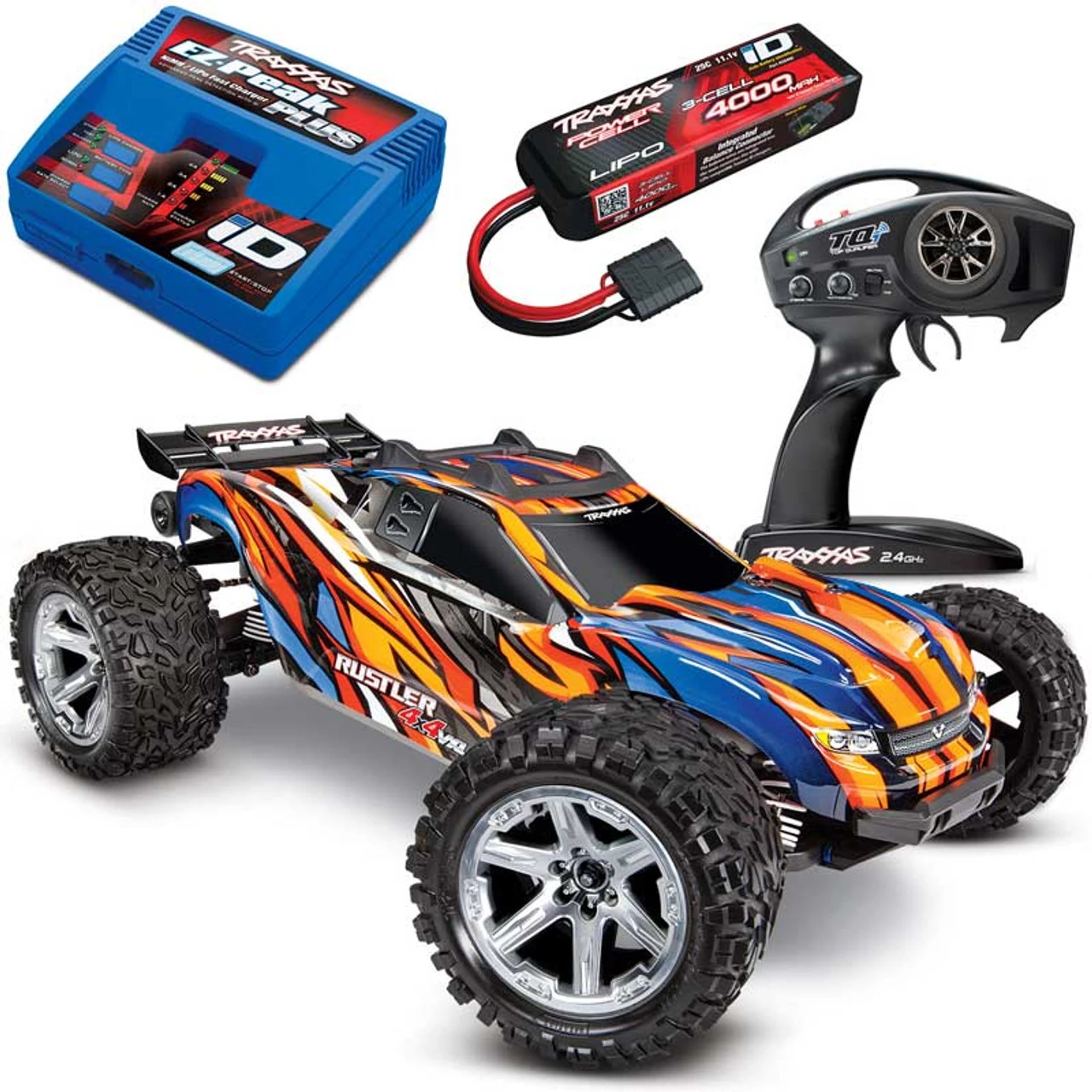 This is the Traxxas Rustler 4×4 VXL Brushless Ready-to-Run Stadium Truck COMBO with 3S 4000mAh LiPo and EZ-Peak ID charger for all-out 60+MPH speeds and incredible bashing potential! Built from the ground up, incorporating all of the latest Traxxas innovations, the Rustler 4×4 VXL is equipped with a new chassis, clipless body mounting, self-righting, and is capable of 60+MPH on the included 3S LiPo power.